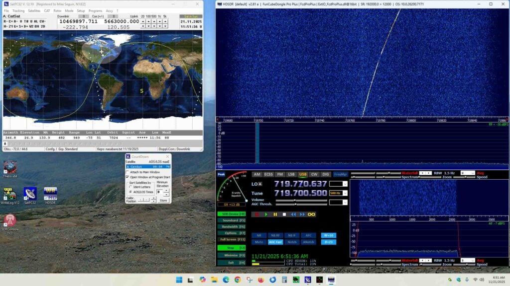Mike Seguin, N1JEz, reports the successful reception of the University of Arizona's CatSat's 10 GHz downlink on 10.47 GHz on the morning of November 21, 2025. The satellite's linear transponder uses 10 GHz down and 5 GHz up. More information is available at https://catsat.arizona.edu/