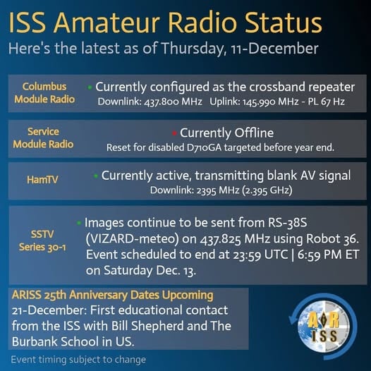 [ANS thanks Charlie Sufana, AJ9N, one of the ARISS operation team mentors for the above information.]