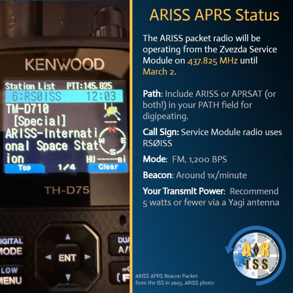 Amateur Radio on the International Space Station (ARISS) reports that the packet radio in the Zvezda Service Module has been configured for temporary APRS operation on 437.825 MHz. The system is expected to remain