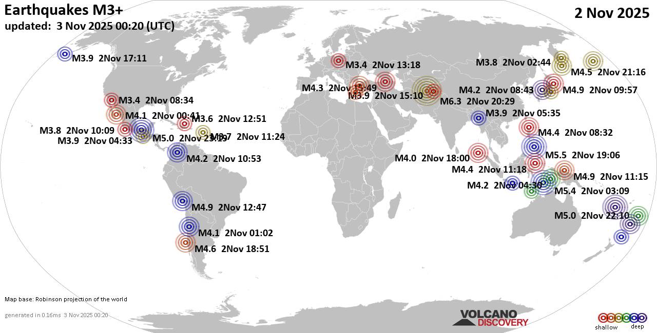 World Earthquake Report for Sunday, 2 November 2025 Worldwide earthquakes above magnitude 3 during the past 24 hours on 3 Nov 2025 Summary: 1 quake 6.0+, 4 quakes 5.0+, 37 quakes 4.0+, 133 quakes 3.0+, 386 quakes 2.0+ (561 total)This report is being updated every hour.Magnitude 6+: 1 earthquake Magnitude 5+: 4 earthquakes Magnitude 4+: 37 earthquakes Magnitude 3+: 133 earthquakes Magnitude 2+: 386 earthquakes No quakes of magnitude 7 or higher 10 largest earthquakes in the world (past 24 hours)Monday, Nov 3, 2025, at 12:59 am (GMT +4:30) - Monday, Nov 3, 2025, at 03:06 am (GMT +8) - Sunday, Nov 2, 2025, at 12:09 pm (GMT +9) - Sunday, Nov 2, 2025, at 05:19 pm (Mexico City time) - Monday, Nov 3, 2025, at 09:10 am (GMT +11) - Sunday, Nov 2, 2025, at 07:47 am (Lima time) - Sunday, Nov 2, 2025, at 08:15 pm (Jayapura time) - Sunday, Nov 2, 2025, at 06:57 pm (GMT +9) - Sunday, Nov 2, 2025, at 09:40 pm (GMT +13) - Sunday, Nov 2, 2025, at 05:06 pm (GMT +13) - Earthquakes reported feltMonday, Nov 3, 2025, at 12:59 am (GMT +4:30) - Monday, Nov 3, 2025, at 03:06 am (GMT +8) - Sunday, Nov 2, 2025, at 07:49 pm (Yerevan time) - Sunday, Nov 2, 2025, at 01:51 pm (GMT -5) - Sunday, Nov 2, 2025, at 09:28 am (Athens time) - Sunday, Nov 2, 2025, at 05:05 am (Los Angeles time) - Sunday, Nov 2, 2025, at 03:41 pm (Istanbul time) - Sunday, Nov 2, 2025, at 05:53 am (Bogota time) - Saturday, Nov 1, 2025, at 11:03 pm (Costa Rica time) - Sunday, Nov 2, 2025, at 12:09 pm (GMT +9) - Sunday, Nov 2, 2025, at 05:45 pm (Paris time) - Sunday, Nov 2, 2025, at 09:28 pm (Rome time) - Sunday, Nov 2, 2025, at 02:18 pm (Warsaw time) - Sunday, Nov 2, 2025, at 01:58 pm (Jakarta time) - Sunday, Nov 2, 2025, at 05:47 pm (Paris time) - Sunday, Nov 2, 2025, at 04:32 pm (Manila time) - Sunday, Nov 2, 2025, at 06:33 pm (Istanbul time) - Sunday, Nov 2, 2025, at 07:41 am (Lima time) - Sunday, Nov 2, 2025, at 09:07 pm (Istanbul time) - Sunday, Nov 2, 2025, at 12:09 pm (Istanbul time) - Sunday, Nov 2, 2025, at 11:50 am (Santiago time) - Sunday, Nov 2, 2025, at 06:43 am (Athens time) - Sunday, Nov 2, 2025, at 03:46 am (Athens time) - Sunday, Nov 2, 2025, at 07:01 pm (Istanbul time) - Monday, Nov 3, 2025, at 03:03 am (Efate time) - Sunday, Nov 2, 2025, at 05:19 pm (Mexico City time) - Sunday, Nov 2, 2025, at 12:19 pm (Manila time) - Sunday, Nov 2, 2025, at 05:24 pm (Istanbul time) - Earthquake stats  https://www.volcanodiscovery.com/earthquake/news/285780/World-Earthquake-Report-for-Sunday-2-November-2025.html