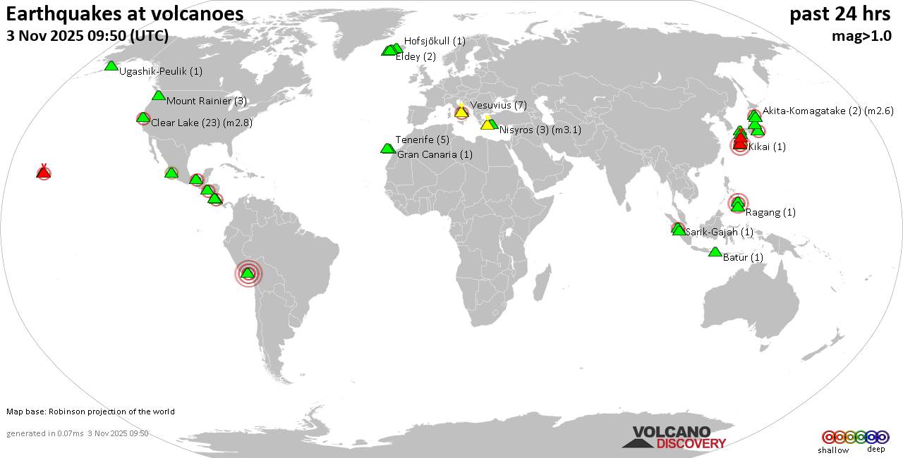 Volcano earthquake report for Monday, 3 Nov 2025 World map showing volcanoes with shallow (less than 50 km) earthquakes within 20 km radius during the past 24 hours on 3 Nov 2025 Number in brackets indicate nr of quakes. Quakes detected near: Abu (2 quakes between mag 1.0-2.0), Akuseki-jima (1 quake mag 3.3), Barva (1 quake mag 1.1), Batur (1 quake mag 1.9), Brennisteinsfjöll (3 quakes between mag 0.5-1.0), Campi Flegrei (Phlegrean Fields) (67 quakes between mag 0.1-2.1) Clear Lake (22 quakes between mag 0.4-2.3), El Chichón (13 quakes between mag 1.4-2.6), Eldey (3 quakes between mag 0.7-1.5), Eyafjallajökull (1 quake mag 1.1), Gran Canaria (3 quakes between mag 1.1-1.3), Hibok-Hibok (1 quake mag 3.0), Hofsjökull (1 quake mag 1.0), Huambo (1 quake mag 4.3), Iwate (1 quake mag 1.2), Katla (1 quake mag 1.2), Kikai (1 quake mag 1.2), Kilauea (1 quake mag 2.1), Kolbeinsey Ridge (2 quakes between mag 1.9-2.1), Kolumbo (4 quakes between mag 0.9-1.6), Krísuvík (9 quakes between mag 0.1-1.2), Kurikoma (4 quakes between mag 0.1-1.2), La Palma (1 quake mag 1.6), Laguna Aramuaca (1 quake mag 2.7), Ljósufjöll (4 quakes between mag 0.3-1.4), Norikura (8 quakes between mag 0.1-1.6), Platanar (3 quakes between mag 1.8-3.2), Prestahnukur (1 quake mag 1.2), Reporoa (4 quakes between mag 1.2-2.0), Rinjani (1 quake mag 2.0), Santorini (3 quakes between mag 1.2-2.1), Shishaldin (3 quakes between mag 1.0-1.4), Talang (1 quake mag 2.3), Tenerife (4 quakes between mag 0.7-1.0), Tenorio (2 quakes between mag 1.5-2.4), Tjörnes Fracture Zone (2 quakes between mag 0.9-1.7), To-shima (1 quake mag 1.5), Tsurumi (1 quake mag 1.1), Ugashik-Peulik (2 quakes between mag 0.9-1.5), Vesuvius (3 quakes between mag 0.1-1.5), Yake-dake (5 quakes between mag 0.2-1.4) (updated 00h50) Note: Earthquakes within 20 km from and at depths less than 50 km under active volcanoes are reported. The list is not complete because many volcanoes are not monitored and/or seismic data in high resolution is not available publicly.