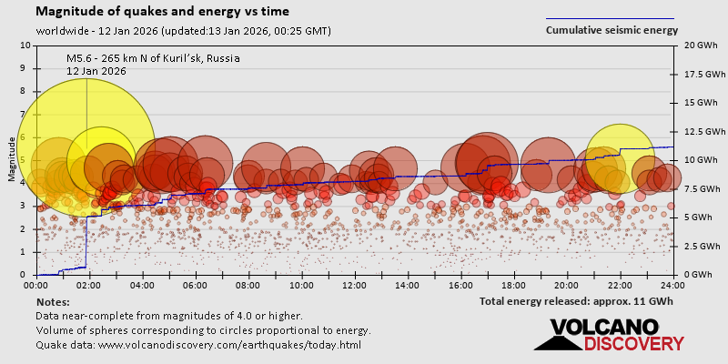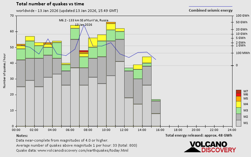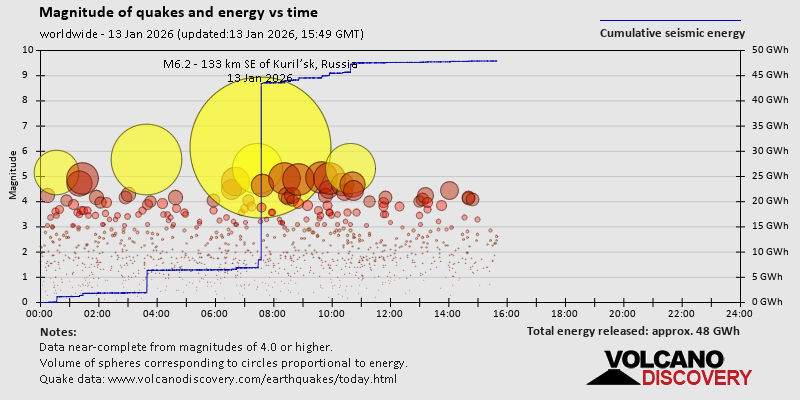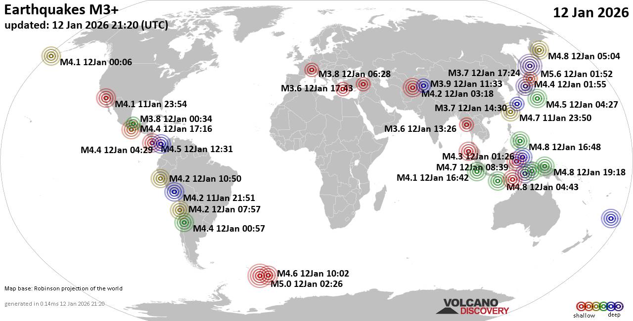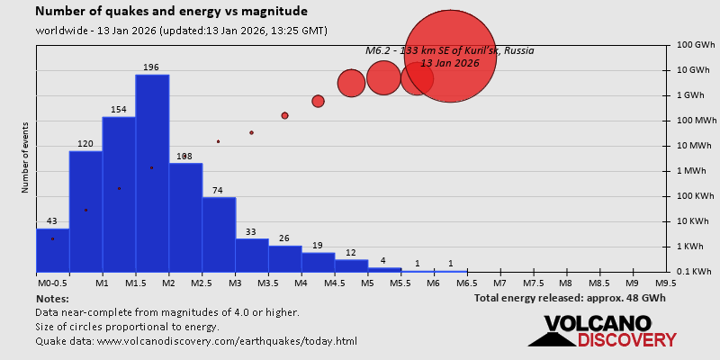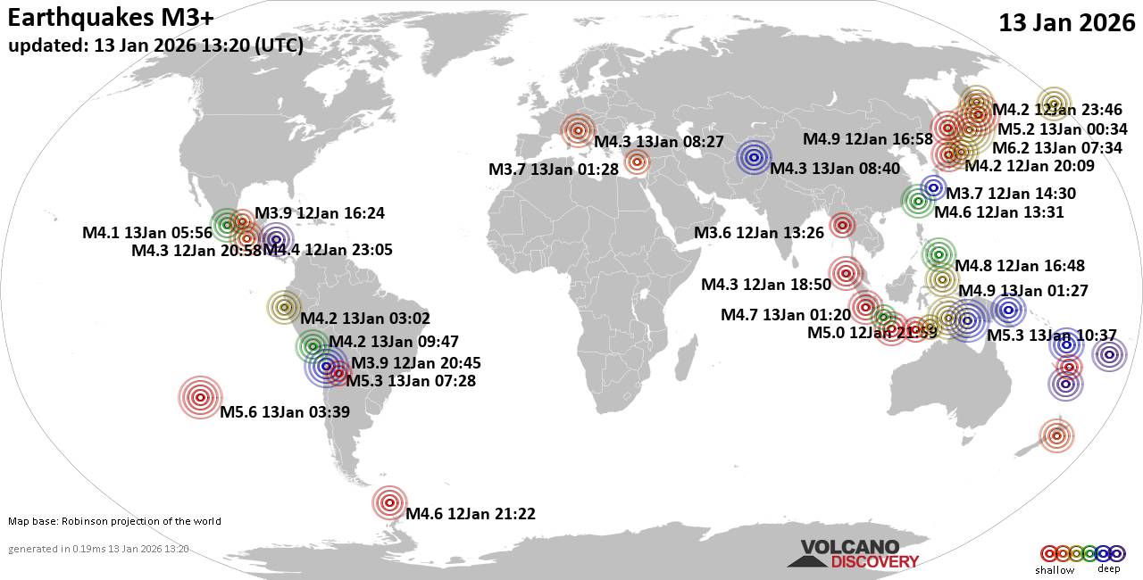 World Earthquake Report for Tuesday, 13 January 2026 Worldwide earthquakes above magnitude 3 during the past 24 hours on 13 Jan 2026 Summary: 1 quake 6.0+, 5 quakes 5.0+, 52 quakes 4.0+, 133 quakes 3.0+, 352 quakes 2.0+ (543 total)This report is being updated every hour.Magnitude 6+: 1 earthquake Magnitude 5+: 5 earthquakes Magnitude 4+: 52 earthquakes Magnitude 3+: 133 earthquakes Magnitude 2+: 352 earthquakes No quakes of magnitude 7 or higher 10 largest earthquakes in the world (past 24 hours)Tuesday, Jan 13, 2026, at 06:34 pm (GMT +11) - Monday, Jan 12, 2026, at 08:39 pm (GMT -7) - Tuesday, Jan 13, 2026, at 04:28 am (Santiago time) - Tuesday, Jan 13, 2026, at 07:37 pm (GMT +9) - Tuesday, Jan 13, 2026, at 10:34 am (GMT +10) - Tuesday, Jan 13, 2026, at 06:59 am (GMT +9) - Tuesday, Jan 13, 2026, at 07:51 pm (GMT +11) - Tuesday, Jan 13, 2026, at 07:39 pm (GMT +10) - Tuesday, Jan 13, 2026, at 01:58 am (GMT +9) - Tuesday, Jan 13, 2026, at 07:54 pm (GMT +10) - Earthquakes reported feltTuesday, Jan 13, 2026, at 09:27 am (Rome time) - Tuesday, Jan 13, 2026, at 09:29 am (GMT +1) - Monday, Jan 12, 2026, at 11:16 am (GMT -6) - Tuesday, Jan 13, 2026, at 11:21 pm (Auckland time) - Tuesday, Jan 13, 2026, at 12:48 am (Manila time) - Tuesday, Jan 13, 2026, at 10:35 am (GMT +8) - Monday, Jan 12, 2026, at 09:31 pm (Taipei time) - Tuesday, Jan 13, 2026, at 04:28 am (Santiago time) - Tuesday, Jan 13, 2026, at 12:57 am (GMT -5) - Tuesday, Jan 13, 2026, at 03:28 am (GMT +2) - Tuesday, Jan 13, 2026, at 06:34 pm (GMT +11) - Monday, Jan 12, 2026, at 04:27 pm (GMT +2) - Monday, Jan 12, 2026, at 05:45 pm (GMT -3) - Monday, Jan 12, 2026, at 07:04 pm (GMT +2) - Tuesday, Jan 13, 2026, at 10:21 am (GMT +9) - Tuesday, Jan 13, 2026, at 01:50 am (Jakarta time) - Tuesday, Jan 13, 2026, at 05:20 am (GMT +9) - Tuesday, Jan 13, 2026, at 07:25 am (Kolkata time) - Monday, Jan 12, 2026, at 07:06 pm (Istanbul time) - Tuesday, Jan 13, 2026, at 09:43 pm (GMT +11) - Tuesday, Jan 13, 2026, at 11:57 am (GMT +1) - Monday, Jan 12, 2026, at 11:03 pm (GMT +8) - Tuesday, Jan 13, 2026, at 10:53 am (GMT +4) - Earthquake stats  https://www.volcanodiscovery.com/earthquake/news/291815/World-Earthquake-Report-for-Tuesday-13-January-2026.html