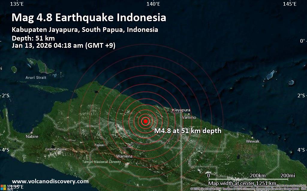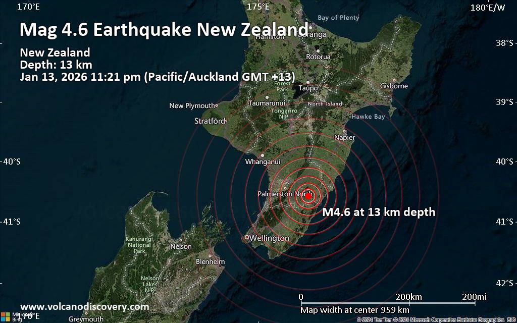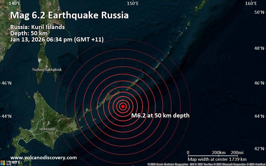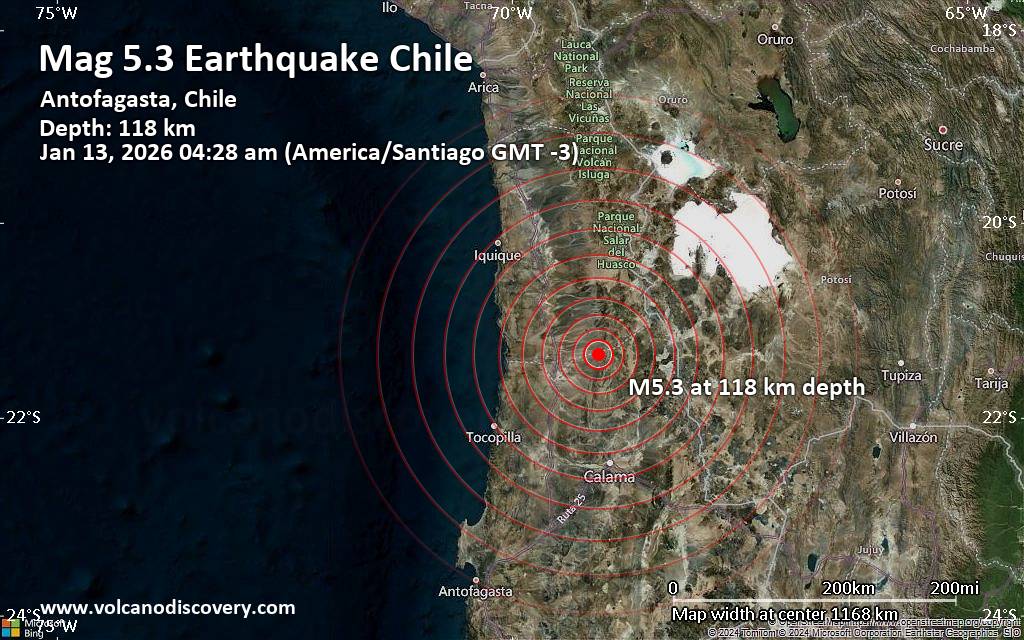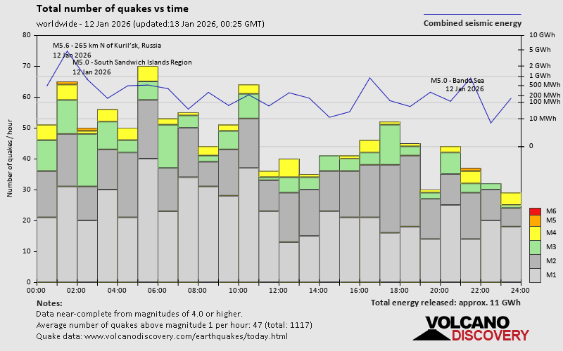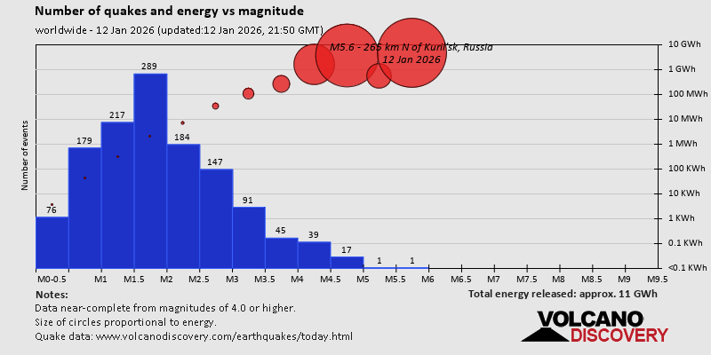 World Earthquake Report for Tuesday, 13 January 2026 Worldwide earthquakes above magnitude 3 during the past 24 hours on 13 Jan 2026 Summary: 1 quake 6.0+, 5 quakes 5.0+, 52 quakes 4.0+, 133 quakes 3.0+, 352 quakes 2.0+ (543 total)This report is being updated every hour.Magnitude 6+: 1 earthquake Magnitude 5+: 5 earthquakes Magnitude 4+: 52 earthquakes Magnitude 3+: 133 earthquakes Magnitude 2+: 352 earthquakes No quakes of magnitude 7 or higher 10 largest earthquakes in the world (past 24 hours)Tuesday, Jan 13, 2026, at 06:34 pm (GMT +11) - Monday, Jan 12, 2026, at 08:39 pm (GMT -7) - Tuesday, Jan 13, 2026, at 04:28 am (Santiago time) - Tuesday, Jan 13, 2026, at 07:37 pm (GMT +9) - Tuesday, Jan 13, 2026, at 10:34 am (GMT +10) - Tuesday, Jan 13, 2026, at 06:59 am (GMT +9) - Tuesday, Jan 13, 2026, at 07:51 pm (GMT +11) - Tuesday, Jan 13, 2026, at 07:39 pm (GMT +10) - Tuesday, Jan 13, 2026, at 01:58 am (GMT +9) - Tuesday, Jan 13, 2026, at 07:54 pm (GMT +10) - Earthquakes reported feltTuesday, Jan 13, 2026, at 09:27 am (Rome time) - Tuesday, Jan 13, 2026, at 09:29 am (GMT +1) - Monday, Jan 12, 2026, at 11:16 am (GMT -6) - Tuesday, Jan 13, 2026, at 11:21 pm (Auckland time) - Tuesday, Jan 13, 2026, at 12:48 am (Manila time) - Tuesday, Jan 13, 2026, at 10:35 am (GMT +8) - Monday, Jan 12, 2026, at 09:31 pm (Taipei time) - Tuesday, Jan 13, 2026, at 04:28 am (Santiago time) - Tuesday, Jan 13, 2026, at 12:57 am (GMT -5) - Tuesday, Jan 13, 2026, at 03:28 am (GMT +2) - Tuesday, Jan 13, 2026, at 06:34 pm (GMT +11) - Monday, Jan 12, 2026, at 04:27 pm (GMT +2) - Monday, Jan 12, 2026, at 05:45 pm (GMT -3) - Monday, Jan 12, 2026, at 07:04 pm (GMT +2) - Tuesday, Jan 13, 2026, at 10:21 am (GMT +9) - Tuesday, Jan 13, 2026, at 01:50 am (Jakarta time) - Tuesday, Jan 13, 2026, at 05:20 am (GMT +9) - Tuesday, Jan 13, 2026, at 07:25 am (Kolkata time) - Monday, Jan 12, 2026, at 07:06 pm (Istanbul time) - Tuesday, Jan 13, 2026, at 09:43 pm (GMT +11) - Tuesday, Jan 13, 2026, at 11:57 am (GMT +1) - Monday, Jan 12, 2026, at 11:03 pm (GMT +8) - Tuesday, Jan 13, 2026, at 10:53 am (GMT +4) - Earthquake stats  https://www.volcanodiscovery.com/earthquake/news/291815/World-Earthquake-Report-for-Tuesday-13-January-2026.html