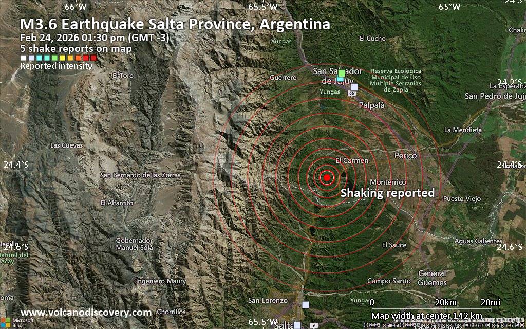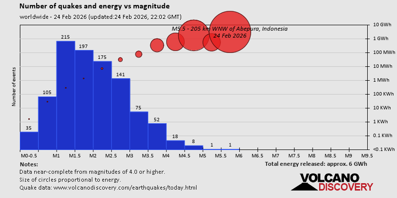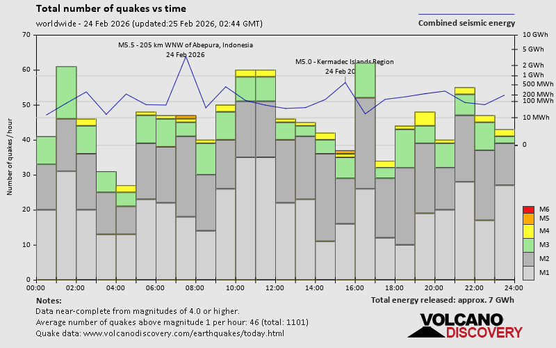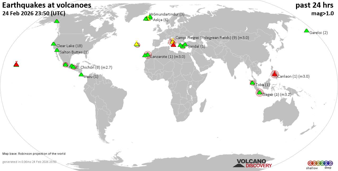Campi Flegrei (Phlegrean Fields) volcano (Italy): 8 earthquakes up to magnitude 2.18 earthquakes occurred near (under) the volcano during 12 hours, the last being recorded quake 1 hour 57 minutes ago. Hypocenter depths ranged between 4.53 and 0.01 km. Earthquake details: (only 5 largest) 2.1 quake 12 km west of Naples, Napoli, Campania, Italy, Feb 24, 2026 11:39 pm (GMT +1) (7 km NW) 2.0 quake Tyrrhenian Sea, 19 km northeast of Isola d'Ischia Island, Italy, Feb 24, 2026 11:40 am (GMT +1) (3 km SW) 0.5 quake Tyrrhenian Sea, 19 km northeast of Isola d'Ischia Island, Italy, Feb 24, 2026 10:12 pm (GMT +1) (4 km SSW) 0.1 quake 2 km southeast of Pozzuoli, Napoli, Campania, Italy, Feb 24, 2026 11:49 pm (GMT +1) (2 km WNW) 0.1 quake 2.7 km northwest of Monterusciello, Napoli, Campania, Italy, Feb 24, 2026 11:52 pm (GMT +1) (9 km NW) All earthquakes at Campi Flegrei (Phlegrean Fields)Canlaon volcano (Central Philippines): magnitude 3.0 earthquakeA magnitude 3.0 earthquake occurred at the volcano 20 hours ago. The quake, which might be volcanic in origin, was located at a depth of 10.00 km depth at 18 km distance NW from the volcano. Earthquake details: Reported seismic-like event (likely no quake): 18 km south of Bacolod City, Philippines, Feb 24, 2026 12:33 pm (GMT +8) (18 km NW) All earthquakes at CanlaonClear Lake volcano (California): 18 earthquakes up to magnitude 1.6Possible earthquake swarm: 18 earthquakes occurred near (under) the volcano during 22 hours, the last being recorded quake 1 hour 41 minutes ago. Hypocenter depths ranged between 22.91 and 1.07 km. Earthquake details: (only 5 largest) 1.6 quake Sonoma County, 14 mi southwest of Clearlake, Lake County, California, United States, Feb 24, 2026 03:09 pm (GMT -8) (17 km S) 1.6 quake 12 mi southwest of Clearlake, Lake County, California, United States, Feb 24, 2026 10:47 am (GMT -8) (15 km S) 1.5 quake 27 mi north of Santa Rosa, Sonoma County, California, United States, Feb 24, 2026 01:59 pm (GMT -8) (18 km SSW) 1.5 quake Sonoma County, 13 mi southwest of Clearlake, Lake County, California, United States, Feb 23, 2026 05:15 pm (GMT -8) (16 km SSW) 1.3 quake Lake County, 27 mi north of Santa Rosa, Sonoma County, California, United States, Feb 23, 2026 08:09 pm (GMT -8) (16 km S) All earthquakes at Clear LakeDon Joao de Castro Bank volcano (Azores): magnitude 2.8 earthquakeA magnitude 2.8 earthquake occurred at the volcano 18 hours ago. The quake, which might be volcanic in origin, was located at a depth of 2.00 km depth at 16 km distance SE from the volcano. Earthquake details: 2.8 quake North Atlantic Ocean, 85 km northwest of Ponta Delgada, Azores, Portugal, Feb 24, 2026 06:10 am (GMT -1) (16 km SE) All earthquakes at Don Joao de Castro BankEl Chichón volcano (Southern Mexico): 8 earthquakes up to magnitude 2.78 earthquakes occurred near (under) the volcano during 7 hours, the last being recorded quake 15 hours ago. Hypocenter depths ranged between 3.00 and 1.50 km. Earthquake details: (only 5 largest) 2.7 quake Estado de Chiapas, 36 km southwest of Teapa, Estado de Tabasco, Mexico, Feb 24, 2026 02:19 am (GMT -6) (1 km N) 2.6 quake Estado de Chiapas, 37 km southwest of Teapa, Estado de Tabasco, Mexico, Feb 24, 2026 01:22 am (GMT -6) (1 km NNW) 2.6 quake Estado de Chiapas, 37 km southwest of Teapa, Estado de Tabasco, Mexico, Feb 24, 2026 02:46 am (GMT -6) (1 km S) 2.4 quake Estado de Chiapas, 36 km southwest of Teapa, Estado de Tabasco, Mexico, Feb 23, 2026 10:36 pm (GMT -6) (2 km N) 2.2 quake Estado de Chiapas, 38 km southwest of Teapa, Estado de Tabasco, Mexico, Feb 24, 2026 03:22 am (GMT -6) (1 km SW) All earthquakes at El ChichónEtna volcano (Italy): 4 earthquakes up to magnitude 3.54 earthquakes occurred near (under) the volcano during 10 hours, the last being recorded quake 9 hours ago. Hypocenter depths ranged between 10.00 and 0.75 km. Earthquake details: 3.5 quake Province of Messina, 23 km northwest of Giarre, Catania, Sicily, Italy, Feb 24, 2026 07:40 am (GMT +1) (19 km NNE) 1.7 quake 8.9 km northeast of Adrano, Catania, Sicily, Italy, Feb 24, 2026 01:35 pm (GMT +1) (10 km WSW) 1.1 quake 11 km west of Giarre, Catania, Sicily, Italy, Feb 24, 2026 12:12 pm (GMT +1) (6 km E) 0.9 quake 36 km north of Catania, Catania, Sicily, Italy, Feb 24, 2026 05:15 pm (GMT +1) (9 km NE) All earthquakes at EtnaGagak volcano (West Java): magnitude 3.2 earthquakeA magnitude 3.2 earthquake occurred at the volcano 22 hours ago. The quake, which might be volcanic in origin, was located at a depth of 5.00 km depth at 10 km distance W from the volcano. Earthquake details: 3.2 quake Bogor Regency, 25 km west of Cicurug, Kabupaten Sukabumi, Jawa Barat, Indonesia, Feb 24, 2026 10:08 am (GMT +7) (10 km W) All earthquakes at GagakKolumbo volcano (Greece): magnitude 2.7 earthquakeA magnitude 2.7 earthquake occurred at the volcano 16 hours ago. The quake, which might be volcanic in origin, was located at a depth of 13.70 km depth at 11 km distance E from the volcano. Earthquake details: 2.7 quake Aegean Sea, 20 km northeast of Santorini Island, Greece, Feb 24, 2026 11:16 am (GMT +2) (11 km E) All earthquakes at KolumboLanzarote volcano (Canary Islands): magnitude 3.0 earthquakeA magnitude 3.0 earthquake occurred at the volcano 20 hours ago. The quake, which might be volcanic in origin, was located at a depth of 10.00 km depth at 17 km distance SSW from the volcano. Earthquake details: Reported quake or seismic-like event: 28 km southwest of Arrecife, Las Palmas, Canary Islands, Spain, Feb 24, 2026 05:20 am (GMT +0) (17 km SSW) All earthquakes at LanzaroteMichoacán-Guanajuato volcano (Western & Central Mexico): magnitude 2.8 earthquakeA magnitude 2.8 earthquake occurred at the volcano 17 hours ago. The quake, which might be volcanic in origin, was located at a depth of 10.90 km depth at 9 km distance SW from the volcano. Earthquake details: 2.8 quake 27 km west of Uruapan, Estado de Michoacan de Ocampo, Mexico, Feb 24, 2026 01:56 am (GMT -6) (9 km SW) Al