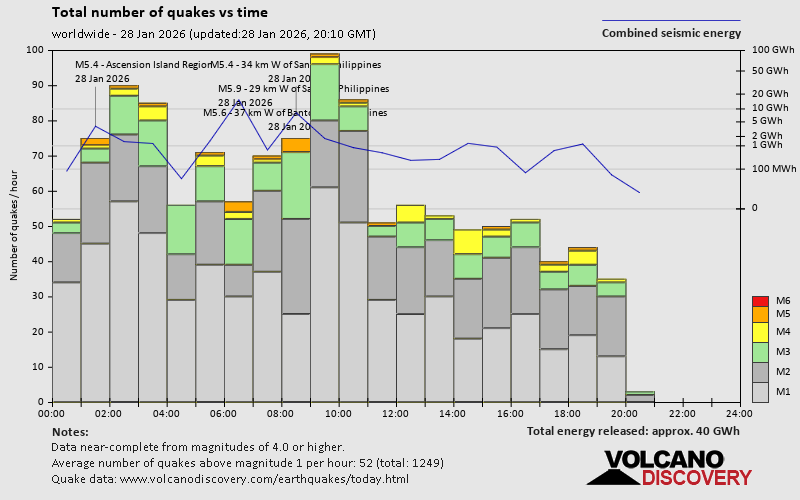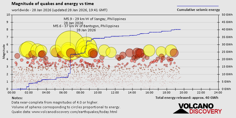 World Earthquake Report for Wednesday, 28 January 2026 Worldwide earthquakes above magnitude 3 during the past 24 hours on 28 Jan 2026 Summary: 19 quakes 5.0+, 51 quakes 4.0+, 213 quakes 3.0+, 457 quakes 2.0+ (740 total)This report is being updated every hour.Magnitude 5+: 19 earthquakes Magnitude 4+: 51 earthquakes Magnitude 3+: 213 earthquakes Magnitude 2+: 457 earthquakes No quakes of magnitude 6 or higher 10 largest earthquakes in the world (past 24 hours)Wednesday, Jan 28, 2026, at 02:47 pm (GMT +8) - Wednesday, Jan 28, 2026, at 04:38 pm (GMT +8) - Wednesday, Jan 28, 2026, at 04:34 pm (GMT +8) - Wednesday, Jan 28, 2026, at 12:58 am (GMT -1) - Wednesday, Jan 28, 2026, at 03:34 pm (GMT +9) - Wednesday, Jan 28, 2026, at 09:41 am (GMT +8) - Wednesday, Jan 28, 2026, at 08:14 pm (GMT +11) - Wednesday, Jan 28, 2026, at 02:31 pm (GMT +8) - Wednesday, Jan 28, 2026, at 01:58 am (GMT -1) - Wednesday, Jan 28, 2026, at 11:24 am (Manila time) - Earthquakes reported feltTuesday, Jan 27, 2026, at 10:59 pm (GMT -5) - Tuesday, Jan 27, 2026, at 04:58 pm (GMT -6) - Wednesday, Jan 28, 2026, at 02:47 pm (GMT +8) - Wednesday, Jan 28, 2026, at 04:34 pm (GMT +8) - Wednesday, Jan 28, 2026, at 04:38 pm (GMT +8) - Tuesday, Jan 27, 2026, at 11:15 pm (GMT +3) - Wednesday, Jan 28, 2026, at 02:31 pm (GMT +8) - Wednesday, Jan 28, 2026, at 09:41 am (GMT +8) - Wednesday, Jan 28, 2026, at 03:47 am (GMT -5) - Tuesday, Jan 27, 2026, at 09:46 pm (GMT -6) - Wednesday, Jan 28, 2026, at 04:48 am (GMT +9) - Wednesday, Jan 28, 2026, at 10:33 pm (GMT +8) - Wednesday, Jan 28, 2026, at 10:23 am (GMT +8) - Wednesday, Jan 28, 2026, at 04:43 pm (Manila time) - Wednesday, Jan 28, 2026, at 09:27 pm (GMT +8) - Tuesday, Jan 27, 2026, at 08:49 pm (GMT -3) - Wednesday, Jan 28, 2026, at 04:39 am (GMT +9) - Wednesday, Jan 28, 2026, at 03:44 pm (GMT +13) - Wednesday, Jan 28, 2026, at 06:06 am (GMT +7) - Wednesday, Jan 28, 2026, at 09:41 pm (GMT +8) - Wednesday, Jan 28, 2026, at 10:34 am (GMT +10) - Tuesday, Jan 27, 2026, at 10:41 pm (GMT -1) - Wednesday, Jan 28, 2026, at 11:24 am (Manila time) - Wednesday, Jan 28, 2026, at 04:04 pm (GMT +8) - Wednesday, Jan 28, 2026, at 08:24 pm (GMT +12) - Wednesday, Jan 28, 2026, at 07:57 pm (GMT +12) - Wednesday, Jan 28, 2026, at 11:58 pm (GMT +8) - Wednesday, Jan 28, 2026, at 08:45 pm (GMT +8) - Tuesday, Jan 27, 2026, at 10:42 pm (GMT -7) - Wednesday, Jan 28, 2026, at 01:38 pm (GMT +8) - Wednesday, Jan 28, 2026, at 01:08 pm (Manila time) - Wednesday, Jan 28, 2026, at 05:24 pm (GMT +8) - Wednesday, Jan 28, 2026, at 08:20 pm (GMT +8) - Wednesday, Jan 28, 2026, at 03:16 am (GMT +8) - Tuesday, Jan 27, 2026, at 03:06 pm (GMT -6) - Wednesday, Jan 28, 2026, at 07:20 am (GMT +8) - Earthquake stats  https://www.volcanodiscovery.com/earthquake/news/293156/World-Earthquake-Report-for-Wednesday-28-January-2026.html
