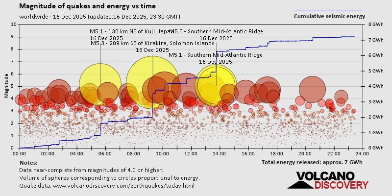 World Earthquake Report for Tuesday, 16 December 2025 Worldwide earthquakes above magnitude 3 during the past 24 hours on 16 Dec 2025 Summary: 8 quakes 5.0+, 37 quakes 4.0+, 172 quakes 3.0+, 423 quakes 2.0+ (640 total)This report is being updated every hour.Magnitude 5+: 8 earthquakes Magnitude 4+: 37 earthquakes Magnitude 3+: 172 earthquakes Magnitude 2+: 423 earthquakes No quakes of magnitude 6 or higher 10 largest earthquakes in the world (past 24 hours)Tuesday, Dec 16, 2025, at 09:06 am (GMT +10) - Tuesday, Dec 16, 2025, at 06:33 am (GMT +11) - Tuesday, Dec 16, 2025, at 08:18 pm (GMT +11) - Tuesday, Dec 16, 2025, at 01:41 am (GMT +2) - Tuesday, Dec 16, 2025, at 03:38 pm (GMT +10) - Tuesday, Dec 16, 2025, at 12:44 pm (GMT -1) - Tuesday, Dec 16, 2025, at 12:45 pm (GMT -1) - Monday, Dec 15, 2025, at 11:48 pm (GMT +4) - Tuesday, Dec 16, 2025, at 09:08 pm (Sakhalin time) - Tuesday, Dec 16, 2025, at 11:39 pm (GMT +12) - Earthquakes reported feltTuesday, Dec 16, 2025, at 01:01 am (GMT +1) - Monday, Dec 15, 2025, at 10:55 pm (Managua time) - Tuesday, Dec 16, 2025, at 01:41 am (GMT +2) - Tuesday, Dec 16, 2025, at 12:50 am (Karachi time) - Tuesday, Dec 16, 2025, at 09:06 am (GMT +10) - Tuesday, Dec 16, 2025, at 04:42 am (Santiago time) - Tuesday, Dec 16, 2025, at 12:14 am (Puerto Rico time) - Tuesday, Dec 16, 2025, at 06:33 am (GMT +11) - Tuesday, Dec 16, 2025, at 04:11 pm (Istanbul time) - Tuesday, Dec 16, 2025, at 05:53 am (GMT -8) - Monday, Dec 15, 2025, at 06:12 pm (GMT -8) - Tuesday, Dec 16, 2025, at 03:10 am (Santiago time) - Tuesday, Dec 16, 2025, at 07:06 am (GMT -8) - Monday, Dec 15, 2025, at 05:29 pm (GMT -8) - Tuesday, Dec 16, 2025, at 11:45 am (GMT +9) - Tuesday, Dec 16, 2025, at 05:39 am (GMT +7) - Tuesday, Dec 16, 2025, at 08:30 am (GMT +2) - Monday, Dec 15, 2025, at 10:21 pm (GMT +2) - Tuesday, Dec 16, 2025, at 06:06 am (GMT +9) - Earthquake stats  https://www.volcanodiscovery.com/earthquake/news/289533/World-Earthquake-Report-for-Tuesday-16-December-2025.html