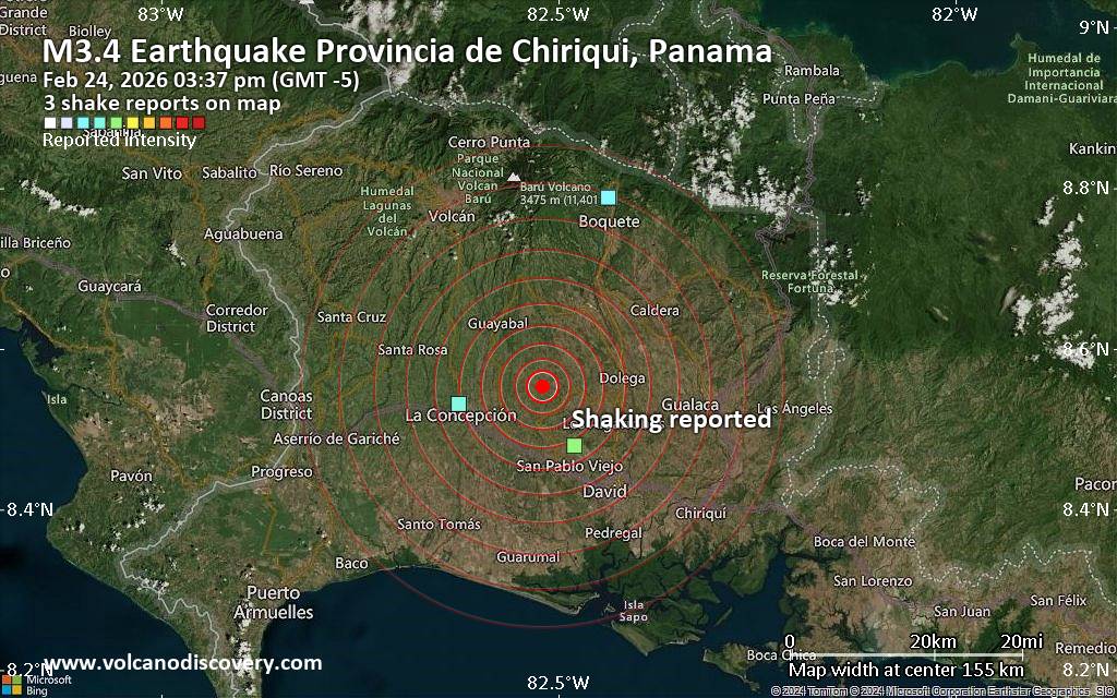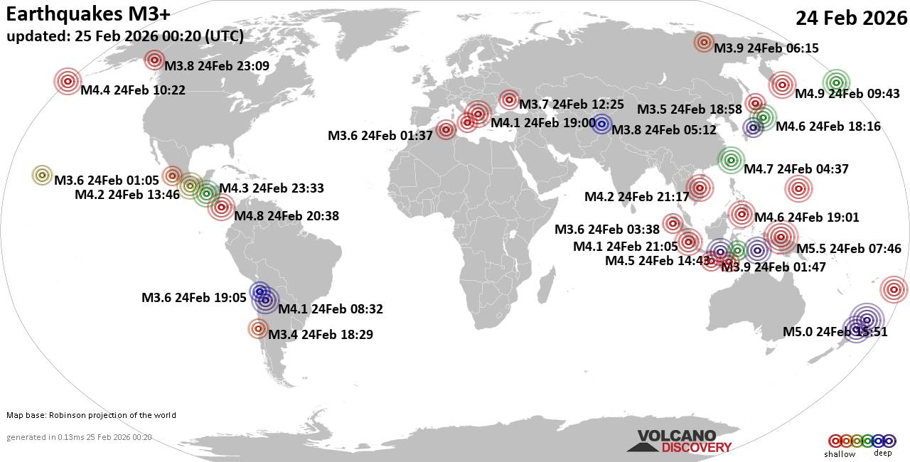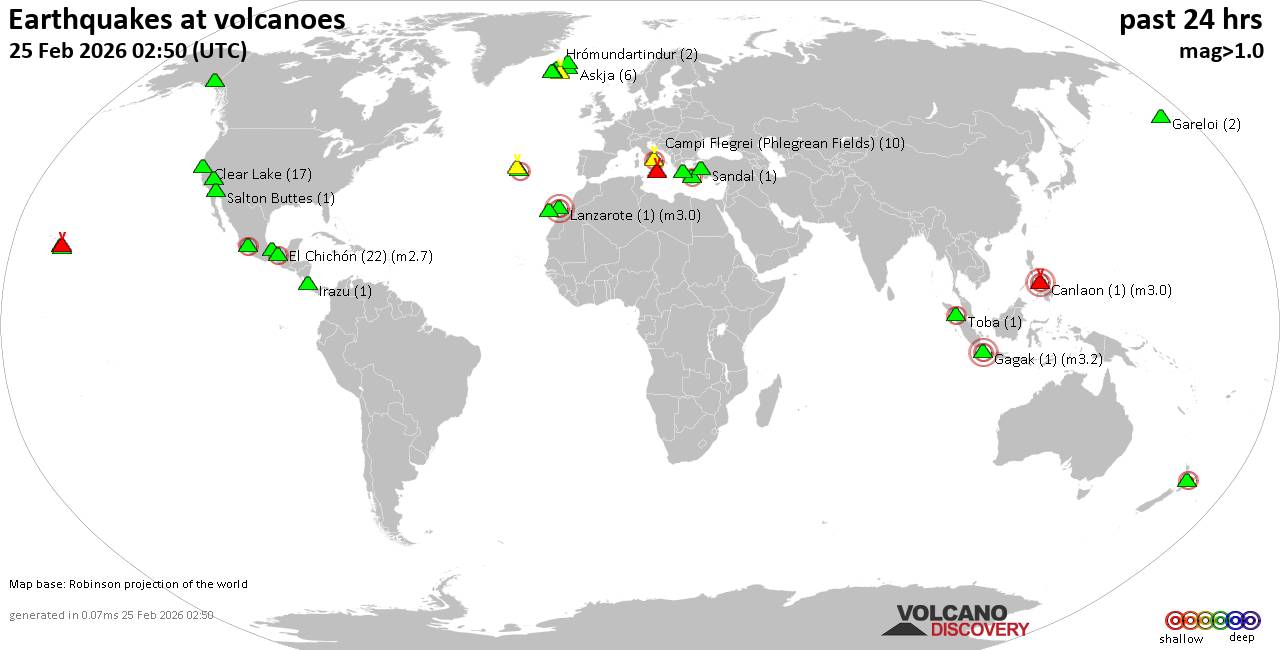 Volcano earthquake report for Wednesday, 25 Feb 2026 World map showing volcanoes with shallow (less than 50 km) earthquakes within 20 km radius during the past 24 hours on 25 Feb 2026 Number in brackets indicate nr of quakes. Quakes detected near: Askja (6 quakes between mag 0.0-1.4), Brennisteinsfjöll (2 quakes between mag 0.6-1.3), Campi Flegrei (Phlegrean Fields) (8 quakes between mag 0.1-2.1), Canlaon (1 quake mag 3.0), Churchill (1 quake mag 1.8), Clear Lake (18 quakes between mag 0.6-1.6) Don Joao de Castro Bank (1 quake mag 2.8), El Chichón (8 quakes between mag 2.1-2.7), Etna (4 quakes between mag 0.9-3.5), Gagak (1 quake mag 3.2), Gareloi (2 quakes between mag 0.8-1.1), Hrómundartindur (3 quakes between mag 0.1-1.6), Irazu (1 quake mag 1.7), Katla (4 quakes between mag 0.5-1.3), Kilauea (2 quakes between mag 1.8-1.9), Kolumbo (1 quake mag 2.7), Krísuvík (2 quakes between mag 0.7-1.0), Lanzarote (1 quake mag 3.0), Loihi (3 quakes between mag 1.7-1.9), Maunaloa (1 quake mag 1.5), Michoacán-Guanajuato (1 quake mag 2.8), Prestahnukur (2 quakes between mag 1.1-1.5), Salton Buttes (1 quake mag 1.3), San Martín (1 quake mag 4.2), Sandal (1 quake mag 1.3), Sousaki (1 quake mag 1.0), Tenerife (2 quakes between mag 0.2-3.0), Terceira (1 quake mag 2.0), Tjörnes Fracture Zone (1 quake mag 1.4), Toba (1 quake mag 2.5) (updated 00h50) Note: Earthquakes within 20 km from and at depths less than 50 km under active volcanoes are reported. The list is not complete because many volcanoes are not monitored and/or seismic data in high resolution is not available publicly.