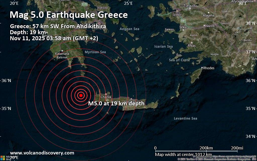 Magnitude 5.0 earthquake strikes near Chania, Crete, Greece An earthquake of magnitude 5.0 occurred early morning on Tuesday, November 11th, 2025, at 3:58 am local time near Chania, Crete, Greece, as reported by the National Observatory of Athens (NOA). According to preliminary data, the quake was located at a shallow depth of 18.90 km. Shallow earthquakes are felt more strongly than deeper ones as they are closer to the surface. The exact magnitude, epicenter, and depth of the quake might be revised within the next few hours or minutes as seismologists review data and refine their calculations, or as other agencies issue their report. Our monitoring service identified a second report from The Seismological Laboratory of the University of Athens (UOA) which listed the quake at magnitude 4.8. Other agencies reporting the same quake include the citizen-seismograph network of RaspberryShake at magnitude 5.2, the European-Mediterranean Seismological Centre (EMSC) at magnitude 5.0, and The Aristotle University of Thessaloniki Geophysical Lab. (AUTH) at magnitude 4.8. Based on the preliminary seismic data, the quake should not have caused any significant damage, but was probably felt by many people as light vibration in the area of the epicenter. Weak shaking might have been felt in Kalives (pop. 15) located 55 km from the epicenter, Kissamos (pop. 4,200) 67 km away, Palaiochora (pop. 2,400) 75 km away, Galatas (pop. 3,200) 95 km away, Daratsos (pop. 4,700) 96 km away, Perivolia (pop. 3,300) 98 km away, Mournies (pop. 5,300) 99 km away, and Chania (pop. 53,900) 101 km away. VolcanoDiscovery will automatically update magnitude and depth if these change and follow up if other significant news about the quake become available. If you’re in the area, please send us your experience through our reporting mechanism, either online or via our mobile app. This will help us provide more first-hand updates to anyone around the globe who wants to know more about this quake.