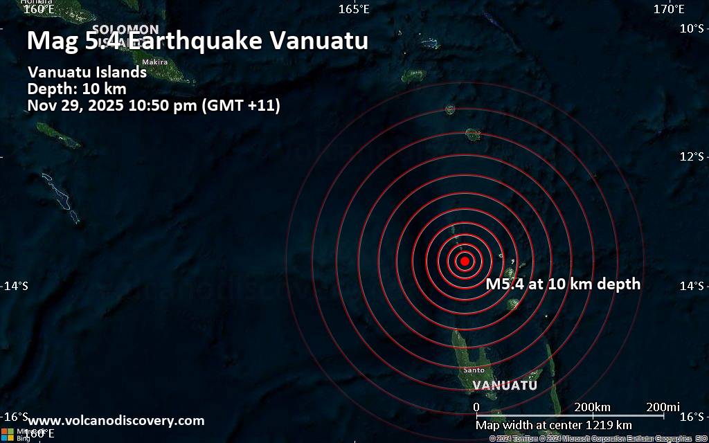 Magnitude 5.4 earthquake strikes near Sola, Torba Province, Vanuatu A shallow magnitude 5.4 earthquake was reported late at night near Sola, Torba Province, Vanuatu. According to Indonesia's Meteorology, Climatology, and Geophysical Agency, the quake hit on Saturday, November 29th, 2025, at 10:50 pm local time at a shallow depth of 10. km. Shallow earthquakes are felt more strongly than deeper ones as they are closer to the surface. The exact magnitude, epicenter, and depth of the quake might be revised within the next few hours or minutes as seismologists review data and refine their calculations, or as other agencies issue their report. Our monitoring service identified a second report from the German Research Centre for Geosciences (GFZ) which listed the quake at magnitude 5.1. A third agency, the citizen-seismograph network of RaspberryShake, reported the same quake at magnitude 5.1. Based on the preliminary seismic data, the quake should not have caused any significant damage, but was probably felt by many people as light vibration in the area of the epicenter. Weak shaking might have been felt in Sola (pop. 1,200) located 92 km from the epicenter. VolcanoDiscovery will automatically update magnitude and depth if these change and follow up if other significant news about the quake become available. If you’re in the area, please send us your experience through our reporting mechanism, either online or via our mobile app. This will help us provide more first-hand updates to anyone around the globe who wants to know more about this quake.