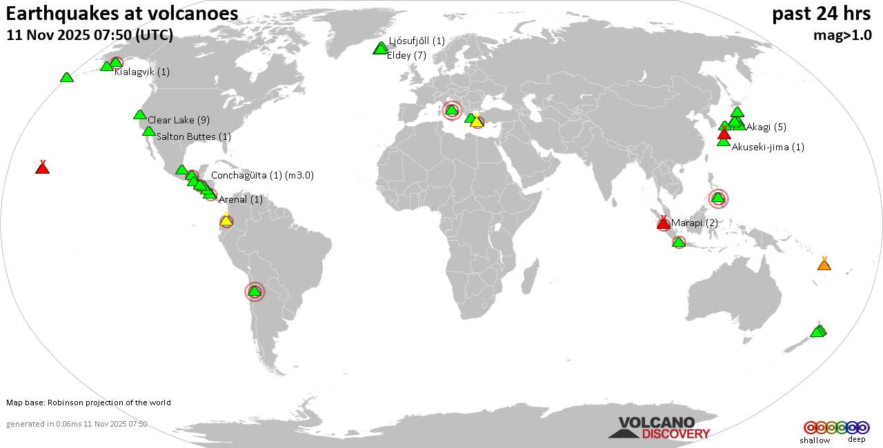 Volcano earthquake report for Tuesday, 11 Nov 2025 World map showing volcanoes with shallow (less than 50 km) earthquakes within 20 km radius during the past 24 hours on 11 Nov 2025 Number in brackets indicate nr of quakes. Quakes detected near: Akagi (8 quakes between mag 0.2-3.0), Akita-Yake-yama (1 quake mag 1.8), Aoba (1 quake mag 1.7), Arenal (1 quake mag 2.1), Cerro Negro de Mayasquer (2 quakes between mag 0.4-2.3), Clear Lake (4 quakes between mag 0.7-1.8) Cuernos de Negros (1 quake mag 3.0), Denison (1 quake mag 1.7), El Chichón (8 quakes between mag 1.8-2.8), Eldey (6 quakes between mag 0.2-1.9), Haku-san (1 quake mag 1.2), Kaguyak (1 quake mag 2.1), Kilauea (1 quake mag 1.7), Kirishima (6 quakes between mag 0.1-1.2), Kolumbo (8 quakes between mag 1.1-2.5), Krísuvík (4 quakes between mag 0.3-1.2), Ljósufjöll (1 quake mag 1.6), Marapi (2 quakes between mag 2.2-2.3), Maunaloa (2 quakes between mag 1.0-1.6), Midagahara (4 quakes between mag 0.3-1.6), Reporoa (1 quake mag 1.3), Reventador (1 quake mag 1.6), Ruapehu (3 quakes between mag 1.0-1.3), Salton Buttes (1 quake mag 1.1), Sanbe (2 quakes between mag 1.0-2.0), Santorini (3 quakes between mag 0.0-1.1), Serdán-Oriental (1 quake mag 3.1), Sete Cidades (1 quake mag 2.4), Socompa (1 quake mag 3.0), Sousaki (1 quake mag 1.4), Tacana (1 quake mag 3.0), Taupo (1 quake mag 1.8), Tenerife (1 quake mag 1.2), Tenorio (1 quake mag 1.5), Terceira (2 quakes between mag 1.9-2.2), Torfajökull (4 quakes between mag 0.6-1.3), Vesuvius (2 quakes between mag 0.1-3.0), Yake-dake (4 quakes between mag 0.1-1.3) (updated 01h50) Note: Earthquakes within 20 km from and at depths less than 50 km under active volcanoes are reported. The list is not complete because many volcanoes are not monitored and/or seismic data in high resolution is not available publicly.
