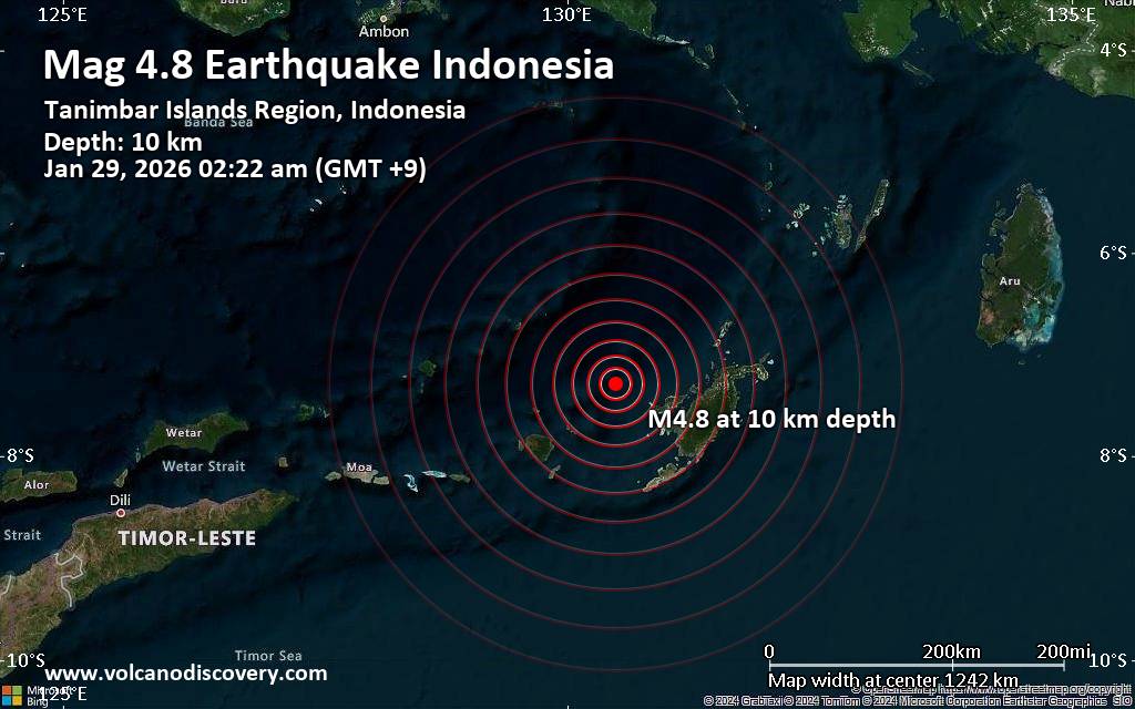 Moderate magnitude 4.8 earthquake 119 km northwest of Saumlaki, Indonesia Just 8 minutes ago, a 4.8-magnitude earthquake struck near Saumlaki, Western Southeast Maluku Regency, Maluku, Indonesia. The tremor was recorded early morning on Thursday, January 29th, 2026, at 2:22 am local time, at a shallow depth of 10. km below the surface. The event was filed by Indonesia's Meteorology, Climatology, and Geophysical Agency, the first seismological agency to report it. A second report was later issued by the German Research Centre for Geosciences (GFZ), which listed it as a magnitude 4.8 earthquake as well. A third agency, the citizen-seismograph network of RaspberryShake, reported the same quake at magnitude 4.8. Towns or cities near the epicenter where the quake might have been felt as very weak shaking include Saumlaki (pop. 13,800) located 119 km from the epicenter. VolcanoDiscovery will automatically update magnitude and depth if these change and follow up if other significant news about the quake become available. If you’re in the area, please send us your experience through our reporting mechanism, either online or via our mobile app. This will help us provide more first-hand updates to anyone around the globe who wants to know more about this quake.