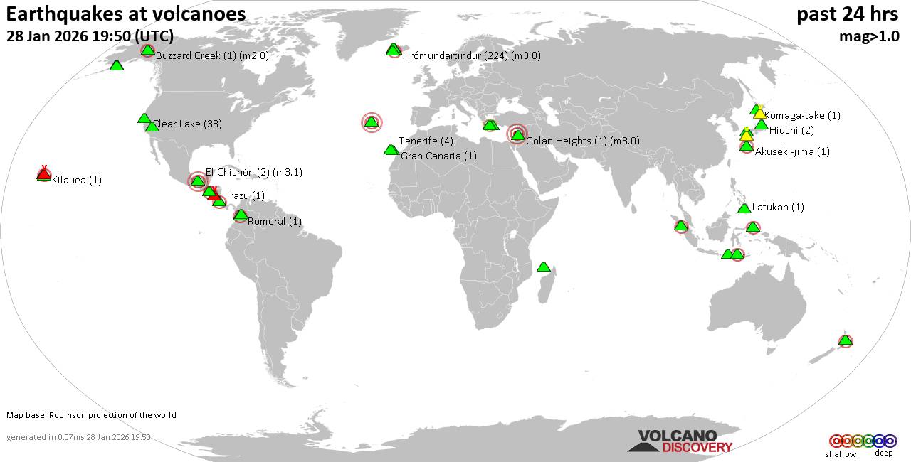 Volcano earthquake report for Wednesday, 28 Jan 2026 World map showing volcanoes with shallow (less than 50 km) earthquakes within 20 km radius during the past 24 hours on 28 Jan 2026 Number in brackets indicate nr of quakes. Quakes detected near: Abu (5 quakes between mag 0.6-1.0), Akuseki-jima (1 quake mag 2.2), Aso (5 quakes between mag 0.4-1.5), Buzzard Creek (1 quake mag 2.8), Clear Lake (37 quakes between mag 0.4-2.2), Coso (7 quakes between mag 0.8-1.5) El Chichón (2 quakes between mag 2.1-3.1), Esjufjöll (1 quake mag 1.7), Fajã de Cima (1 quake mag 3.0), Golan Heights (1 quake mag 3.0), Gran Canaria (1 quake mag 1.1), Hiuchi (1 quake mag 1.1), Hrómundartindur (230 quakes between mag 0.3-3.0), Irazu (1 quake mag 2.2), Jailolo (1 quake mag 2.6), Katmai (2 quakes between mag 0.8-1.1), Kilauea (1 quake mag 2.0), Kolumbo (2 quakes between mag 1.5-2.6), Krísuvík (5 quakes between mag 0.1-1.3), Laacher See (1 quake mag 3.0), Laguna Aramuaca (1 quake mag 2.4), Latukan (1 quake mag 1.6), Ljósufjöll (1 quake mag 1.2), Loihi (1 quake mag 1.9), Maroa (1 quake mag 2.4), Masaya (2 quakes between mag 1.3-1.4), Maunaloa (1 quake mag 2.0), Mayotte Island (1 quake mag 1.6), Milos (1 quake mag 2.7), Novarupta (1 quake mag 1.3), Paluweh (1 quake mag 2.3), Romeral (1 quake mag 2.0), San Diego (1 quake mag 1.5), San Pablo (1 quake mag 1.6), Sibualbuali (1 quake mag 2.0), Tambora (2 quakes between mag 2.8-3.3), Tenerife (4 quakes between mag 1.0-1.7), Towada (2 quakes between mag 1.1-1.1), Trident (1 quake mag 1.1) (updated 17h50) Note: Earthquakes within 20 km from and at depths less than 50 km under active volcanoes are reported. The list is not complete because many volcanoes are not monitored and/or seismic data in high resolution is not available publicly.