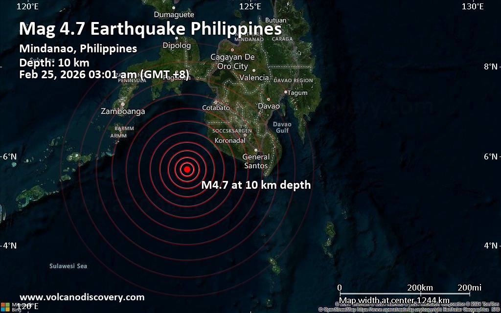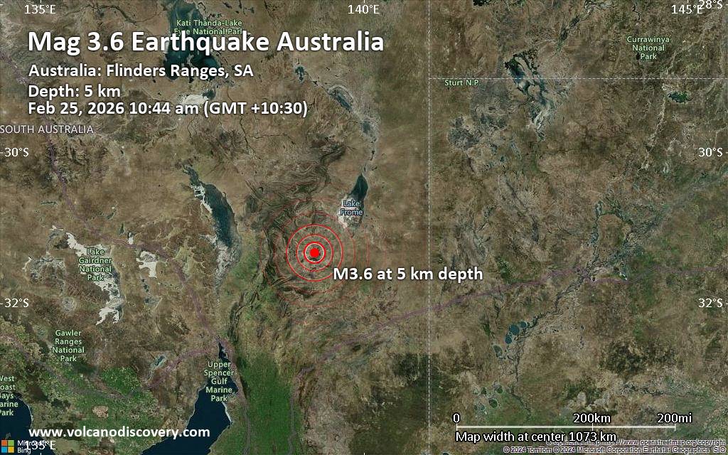 Earthquake data: Date & time: Feb 25, 2026 10:44 am (GMT +10:30) local time (25 Feb 2026 00:14 GMT)Magnitude: 3.6 Depth: 5.00 km Epicenter latitude / longitude: 31.34°S / 139.23°E  ( South Australia, Australia) Primary data source: GeoAuhttps://www.volcanodiscovery.com/earthquake/news/295849/Magnitude-36-earthquake-strikes-near-Blinman-South-Australia-Australia.html