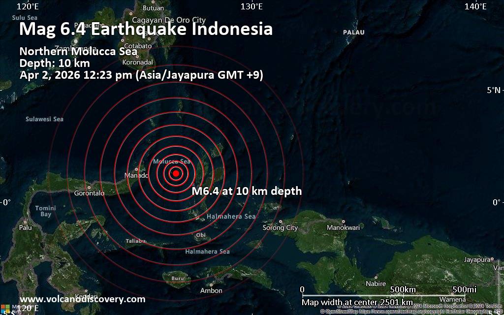Earthquake data: Date & time: Apr 2, 2026 12:23 pm (Jayapura time) local time (2 Apr 2026 03:23 GMT)Magnitude: 6.4 Depth: 10.00 km Epicenter latitude / longitude: 1.28°N / 126.6°E  (Kota Ternate, North Maluku, Indonesia) Primary data source: BMKGhttps://www.volcanodiscovery.com/earthquake/news/299076/Significant-64-quake-hits-near-Ternate-Kota-Ternate-North-Maluku-Indonesia.html