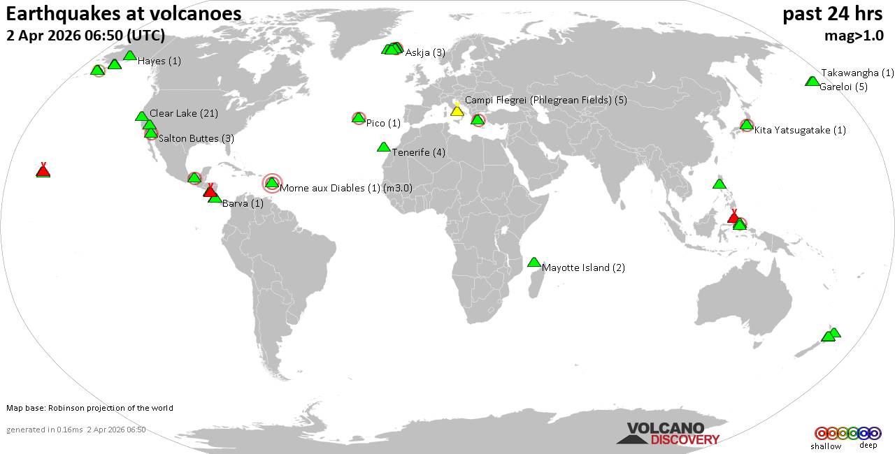Volcano earthquake report for Thursday, 2 Apr 2026 World map showing volcanoes with shallow (less than 50 km) earthquakes within 20 km radius during the past 24 hours on 2 Apr 2026 Number in brackets indicate nr of quakes. Quakes detected near: Apoyeque (1 quake mag 1.7), Askja (3 quakes between mag 0.0-1.2), Barva (1 quake mag 2.1), Campi Flegrei (Phlegrean Fields) (3 quakes between mag 0.1-1.2), Clear Lake (27 quakes between mag 0.2-2.1), Coso (2 quakes between mag 0.9-1.0) El Chichón (3 quakes between mag 1.9-3.0), Gareloi (5 quakes between mag 0.4-1.3), Griggs (1 quake mag 1.0), Grímsvötn (3 quakes between mag 0.7-1.2), Hayes (1 quake mag 1.0), Hrómundartindur (15 quakes between mag 0.0-3.0), Hulubelu (3 quakes between mag 2.5-2.5), Kerlingarfjöll (1 quake mag 1.1), Kilauea (1 quake mag 1.9), Kita Yatsugatake (1 quake mag 2.5), Kupreanof (4 quakes between mag 1.3-2.6), Loihi (1 quake mag 2.1), Loki-Fögrufjöll volcano (2 quakes between mag 0.1-1.2), Masaya (1 quake mag 1.3), Maunaloa (1 quake mag 2.2), Mayotte Island (2 quakes between mag 1.2-1.5), Morne aux Diables (1 quake mag 3.0), Moti (1 quake mag 2.9), Pico (1 quake mag 2.1), Pinatubo (1 quake mag 1.7), Ruapehu (2 quakes between mag 0.7-1.2), Salton Buttes (3 quakes between mag 1.1-2.1), Sousaki (1 quake mag 2.1), Stepovak Bay 4 (1 quake mag 1.4), Tenerife (5 quakes between mag 1.0-1.7), Tongariro (12 quakes between mag 0.7-2.0), Torfajökull (9 quakes between mag 0.1-1.7), Trident (1 quake mag 1.0), Whale Island (1 quake mag 1.8) (updated 03h50) Note: Earthquakes within 20 km from and at depths less than 50 km under active volcanoes are reported. The list is not complete because many volcanoes are not monitored and/or seismic data in high resolution is not available publicly.