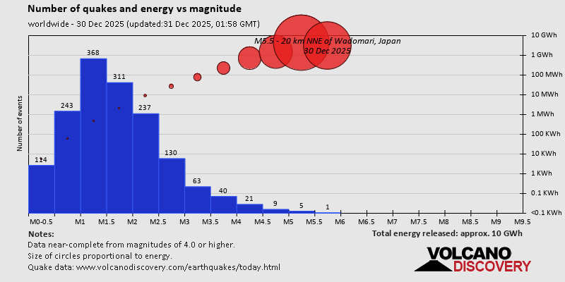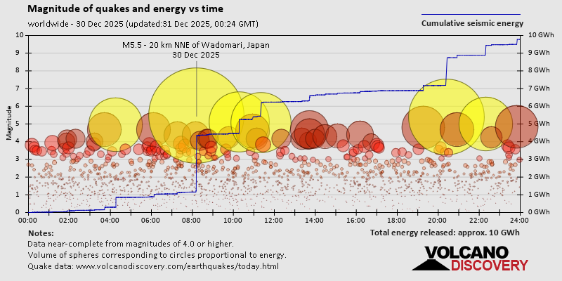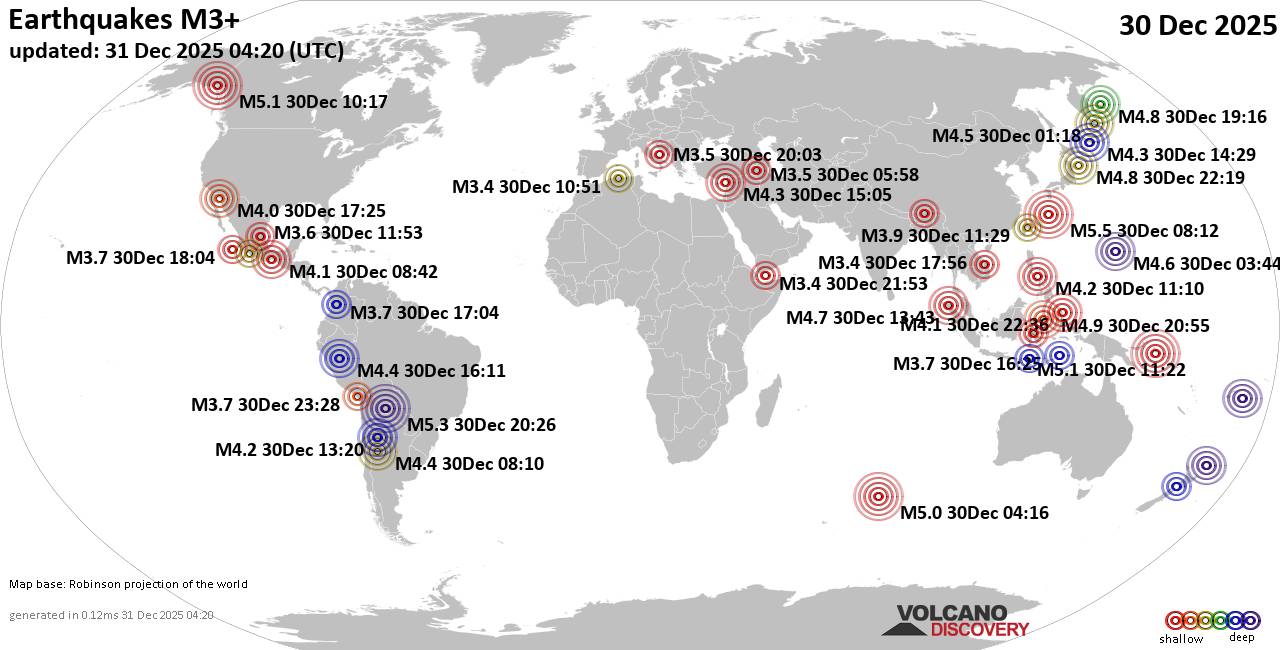 World Earthquake Report for Tuesday, 30 December 2025 Worldwide earthquakes above magnitude 3 during the past 24 hours on 31 Dec 2025 Summary: 5 quakes 5.0+, 32 quakes 4.0+, 134 quakes 3.0+, 376 quakes 2.0+ (547 total)Magnitude 5+: 5 earthquakes Magnitude 4+: 32 earthquakes Magnitude 3+: 134 earthquakes Magnitude 2+: 376 earthquakes No quakes of magnitude 6 or higher 10 largest earthquakes in the world (30 Dec 2025)Tuesday, Dec 30, 2025, at 05:12 pm (GMT +9) - Tuesday, Dec 30, 2025, at 04:26 pm (La Paz time) - Tuesday, Dec 30, 2025, at 09:22 pm (GMT +10) - Tuesday, Dec 30, 2025, at 03:17 am (Whitehorse time) - Tuesday, Dec 30, 2025, at 10:16 am (GMT +6) - Wednesday, Dec 31, 2025, at 04:55 am (GMT +8) - Wednesday, Dec 31, 2025, at 07:16 am (Kamchatka time) - Wednesday, Dec 31, 2025, at 08:19 am (GMT +10) - Wednesday, Dec 31, 2025, at 09:51 am (GMT +10) - Tuesday, Dec 30, 2025, at 08:43 pm (Jakarta time) - Earthquakes reported feltMonday, Dec 29, 2025, at 09:14 pm (Costa Rica time) - Tuesday, Dec 30, 2025, at 05:12 pm (GMT +9) - Tuesday, Dec 30, 2025, at 05:55 am (Kolkata time) - Tuesday, Dec 30, 2025, at 07:10 pm (Manila time) - Tuesday, Dec 30, 2025, at 03:17 am (GMT -4) - Tuesday, Dec 30, 2025, at 05:05 pm (GMT +2) - Tuesday, Dec 30, 2025, at 08:43 pm (Jakarta time) - Tuesday, Dec 30, 2025, at 10:33 pm (Jakarta time) - Monday, Dec 29, 2025, at 09:51 pm (Bogota time) - Tuesday, Dec 30, 2025, at 07:22 am (GMT -5) - Tuesday, Dec 30, 2025, at 03:18 pm (GMT +1) - Tuesday, Dec 30, 2025, at 09:01 pm (Jakarta time) - Tuesday, Dec 30, 2025, at 08:54 pm (Jakarta time) - Tuesday, Dec 30, 2025, at 12:04 pm (Bogota time) - Tuesday, Dec 30, 2025, at 10:22 pm (Jakarta time) - Tuesday, Dec 30, 2025, at 05:10 am (San Juan time) - Tuesday, Dec 30, 2025, at 03:17 am (Whitehorse time) - Tuesday, Dec 30, 2025, at 09:40 pm (GMT +8) - Tuesday, Dec 30, 2025, at 07:29 pm (Taipei time) - Wednesday, Dec 31, 2025, at 01:44 am (GMT +12) - Tuesday, Dec 30, 2025, at 09:35 pm (Kolkata time) - Tuesday, Dec 30, 2025, at 09:16 pm (Jakarta time) - Tuesday, Dec 30, 2025, at 08:29 pm (Jakarta time) - Tuesday, Dec 30, 2025, at 04:34 am (GMT -4) - Monday, Dec 29, 2025, at 09:23 pm (GMT -8) - Tuesday, Dec 30, 2025, at 05:20 am (GMT +1) - Tuesday, Dec 30, 2025, at 09:46 am (Moscow time) - Wednesday, Dec 31, 2025, at 06:58 am (Jakarta time) - Earthquake stats  https://www.volcanodiscovery.com/earthquake/news/290605/World-Earthquake-Report-for-Tuesday-30-December-2025.html