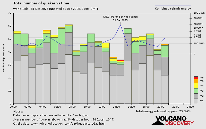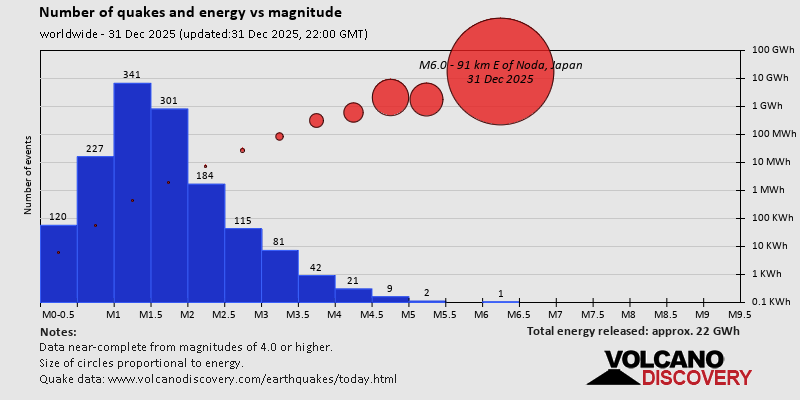 World Earthquake Report for Wednesday, 31 December 2025 Worldwide earthquakes above magnitude 3 during the past 24 hours on 31 Dec 2025 Summary: 1 quake 6.0+, 3 quakes 5.0+, 32 quakes 4.0+, 130 quakes 3.0+, 323 quakes 2.0+ (489 total)This report is being updated every hour.Magnitude 6+: 1 earthquake Magnitude 5+: 3 earthquakes Magnitude 4+: 32 earthquakes Magnitude 3+: 130 earthquakes Magnitude 2+: 323 earthquakes No quakes of magnitude 7 or higher 10 largest earthquakes in the world (past 24 hours)Wednesday, Dec 31, 2025, at 11:26 pm (GMT +9) - Tuesday, Dec 30, 2025, at 04:26 pm (La Paz time) - Wednesday, Dec 31, 2025, at 02:00 pm (GMT +10) - Thursday, Jan 1, 2026, at 12:51 am (GMT +11) - Thursday, Jan 1, 2026, at 02:30 am (GMT +10) - Wednesday, Dec 31, 2025, at 04:55 am (GMT +8) - Tuesday, Dec 30, 2025, at 09:49 pm (Los Angeles time) - Wednesday, Dec 31, 2025, at 08:19 am (GMT +10) - Wednesday, Dec 31, 2025, at 09:51 am (GMT +10) - Wednesday, Dec 31, 2025, at 09:18 pm (GMT +9) - Earthquakes reported feltTuesday, Dec 30, 2025, at 09:49 pm (Los Angeles time) - Wednesday, Dec 31, 2025, at 04:15 am (GMT +1) - Wednesday, Dec 31, 2025, at 04:15 am (GMT +1) - Wednesday, Dec 31, 2025, at 11:26 pm (GMT +9) - Tuesday, Dec 30, 2025, at 10:42 pm (GMT -6) - Tuesday, Dec 30, 2025, at 10:26 pm (GMT -6) - Tuesday, Dec 30, 2025, at 04:26 pm (La Paz time) - Wednesday, Dec 31, 2025, at 01:28 pm (Pontianak time) - Wednesday, Dec 31, 2025, at 09:37 am (Santiago time) - Wednesday, Dec 31, 2025, at 09:13 am (GMT +7) - Wednesday, Dec 31, 2025, at 08:48 pm (Bucharest time) - Wednesday, Dec 31, 2025, at 06:58 am (Jakarta time) - Wednesday, Dec 31, 2025, at 01:58 am (GMT -6) - Wednesday, Dec 31, 2025, at 11:50 pm (GMT +9) - Wednesday, Dec 31, 2025, at 07:28 am (Los Angeles time) - Earthquake stats  https://www.volcanodiscovery.com/earthquake/news/290686/World-Earthquake-Report-for-Wednesday-31-December-2025.html