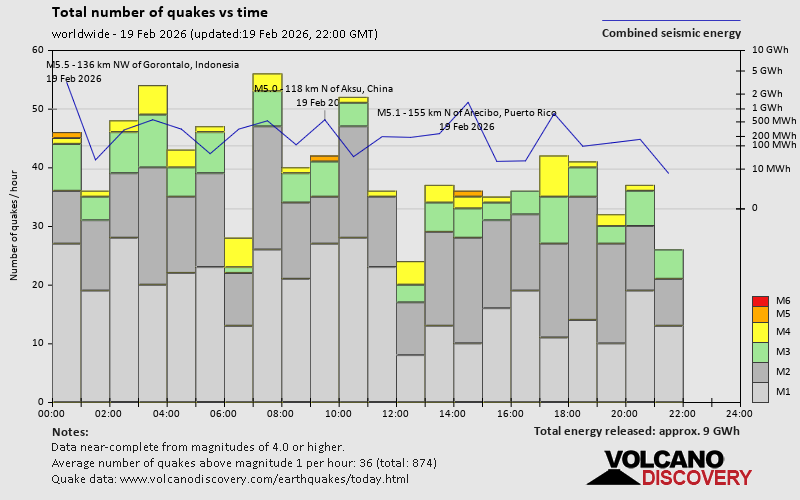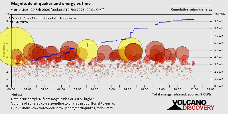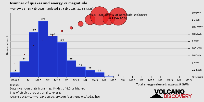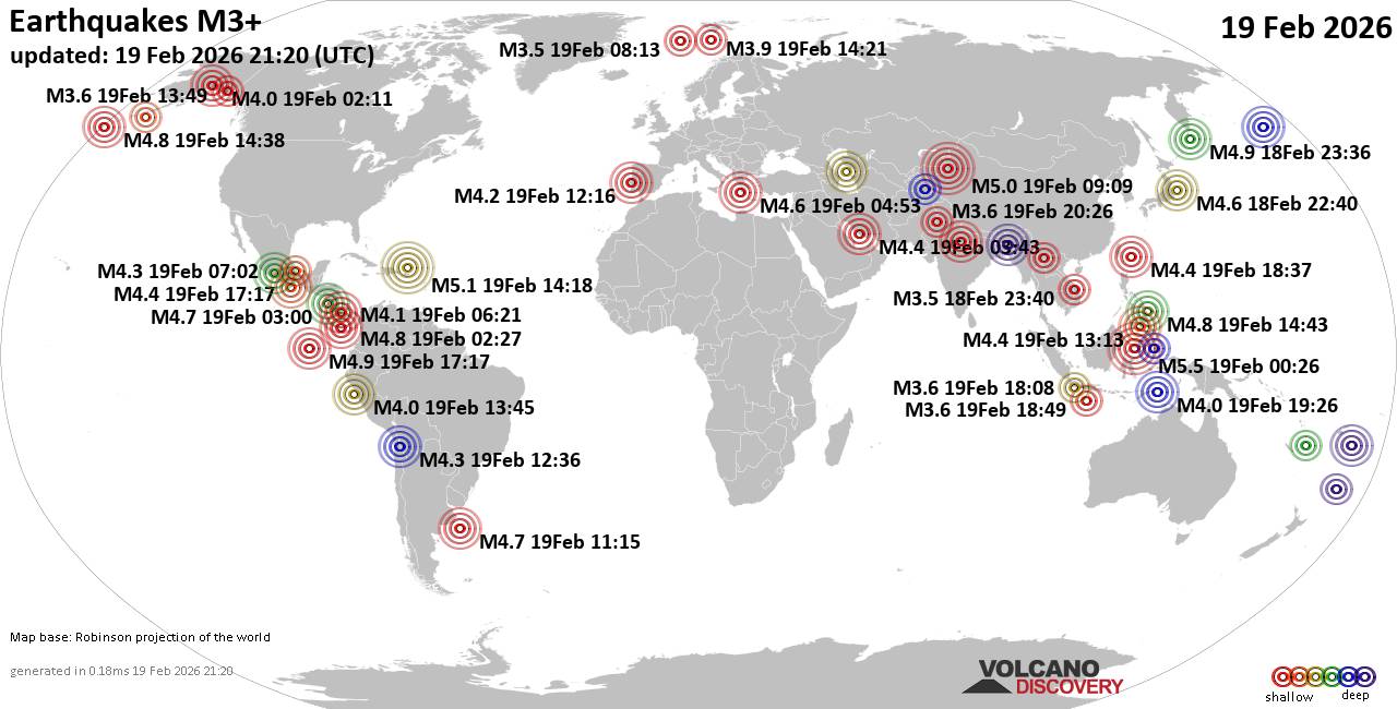 World Earthquake Report for Thursday, 19 February 2026 Worldwide earthquakes above magnitude 3 during the past 24 hours on 19 Feb 2026 Summary: 3 quakes 5.0+, 47 quakes 4.0+, 116 quakes 3.0+, 338 quakes 2.0+ (504 total)This report is being updated every hour.Magnitude 5+: 3 earthquakes Magnitude 4+: 47 earthquakes Magnitude 3+: 116 earthquakes Magnitude 2+: 338 earthquakes No quakes of magnitude 6 or higher 10 largest earthquakes in the world (past 24 hours)Thursday, Feb 19, 2026, at 08:26 am (GMT +8) - Thursday, Feb 19, 2026, at 10:18 am (GMT -4) - Thursday, Feb 19, 2026, at 03:09 pm (Urumqi time) - Thursday, Feb 19, 2026, at 09:36 am (Ust-Nera time) - Thursday, Feb 19, 2026, at 11:17 am (GMT -6) - Thursday, Feb 19, 2026, at 04:02 pm (GMT +9) - Thursday, Feb 19, 2026, at 10:43 pm (Manila time) - Thursday, Feb 19, 2026, at 04:38 am (GMT -10) - Wednesday, Feb 18, 2026, at 09:27 pm (GMT -5) - Thursday, Feb 19, 2026, at 11:34 am (GMT -6) - Earthquakes reported feltThursday, Feb 19, 2026, at 12:13 pm (Universal Time) - Thursday, Feb 19, 2026, at 12:16 pm (Universal Time) - Wednesday, Feb 18, 2026, at 09:00 pm (Managua time) - Thursday, Feb 19, 2026, at 07:15 am (GMT -4) - Wednesday, Feb 18, 2026, at 11:38 pm (GMT +1) - Thursday, Feb 19, 2026, at 10:18 am (GMT -4) - Thursday, Feb 19, 2026, at 06:53 am (Athens time) - Thursday, Feb 19, 2026, at 10:43 pm (Manila time) - Thursday, Feb 19, 2026, at 03:09 pm (Urumqi time) - Thursday, Feb 19, 2026, at 07:28 pm (GMT +2) - Wednesday, Feb 18, 2026, at 08:15 pm (GMT -8) - Thursday, Feb 19, 2026, at 07:26 pm (GMT +2) - Thursday, Feb 19, 2026, at 06:48 am (GMT -6) - Thursday, Feb 19, 2026, at 08:34 pm (GMT +1) - #15: Mag 3.9 Costa Rica - 5 reportsThursday, Feb 19, 2026, at 01:21 pm (GMT -5) - Thursday, Feb 19, 2026, at 09:13 pm (GMT +8) - Thursday, Feb 19, 2026, at 12:35 am (GMT -5) - Thursday, Feb 19, 2026, at 04:21 pm (GMT +1) - Thursday, Feb 19, 2026, at 09:10 pm (GMT +2) - Thursday, Feb 19, 2026, at 05:24 pm (GMT +9) - Thursday, Feb 19, 2026, at 02:22 am (GMT -5) - Thursday, Feb 19, 2026, at 11:17 am (GMT +3) - Thursday, Feb 19, 2026, at 11:17 am (GMT -6) - Thursday, Feb 19, 2026, at 08:26 am (GMT +8) - Thursday, Feb 19, 2026, at 08:47 pm (GMT +2) - Wednesday, Feb 18, 2026, at 04:22 pm (GMT -9) - Wednesday, Feb 18, 2026, at 05:11 pm (GMT -9) - Thursday, Feb 19, 2026, at 07:40 am (GMT +9) - Earthquake stats  https://www.volcanodiscovery.com/earthquake/news/295281/World-Earthquake-Report-for-Thursday-19-February-2026.html