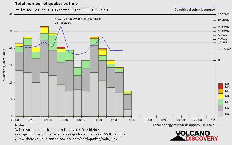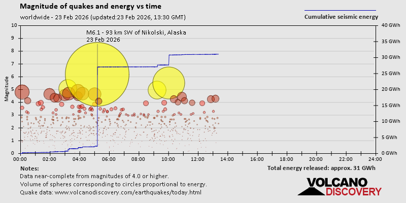 World Earthquake Report for Monday, 23 February 2026 Worldwide earthquakes above magnitude 3 during the past 24 hours on 23 Feb 2026 Summary: 1 quake 7.0+, 2 quakes 6.0+, 6 quakes 5.0+, 31 quakes 4.0+, 138 quakes 3.0+, 332 quakes 2.0+ (510 total)This report is being updated every hour.Magnitude 7+: 1 earthquake Magnitude 6+: 2 earthquakes Magnitude 5+: 6 earthquakes Magnitude 4+: 31 earthquakes Magnitude 3+: 138 earthquakes Magnitude 2+: 332 earthquakes No quakes of magnitude 8 or higher 10 largest earthquakes in the world (past 24 hours)Monday, Feb 23, 2026, at 12:57 am (Kuching time) - Monday, Feb 23, 2026, at 12:07 am (Bangkok time) - Sunday, Feb 22, 2026, at 07:11 pm (GMT -10) - Monday, Feb 23, 2026, at 12:02 am (GMT -10) - Sunday, Feb 22, 2026, at 05:36 pm (GMT -5) - Monday, Feb 23, 2026, at 04:06 am (GMT +11) - Sunday, Feb 22, 2026, at 10:35 pm (GMT +7) - Monday, Feb 23, 2026, at 09:15 pm (GMT +12) - Monday, Feb 23, 2026, at 02:12 pm (Efate time) - Monday, Feb 23, 2026, at 10:54 am (Universal Time) - Earthquakes reported feltMonday, Feb 23, 2026, at 12:57 am (Kuching time) - Sunday, Feb 22, 2026, at 09:40 pm (GMT -8) - Monday, Feb 23, 2026, at 12:07 am (Bangkok time) - Sunday, Feb 22, 2026, at 05:36 pm (GMT -5) - Sunday, Feb 22, 2026, at 10:35 pm (GMT +7) - Sunday, Feb 22, 2026, at 11:22 am (Santiago time) - Sunday, Feb 22, 2026, at 08:25 am (GMT -10) - Sunday, Feb 22, 2026, at 08:56 am (GMT -6) - Sunday, Feb 22, 2026, at 10:39 pm (GMT -3) - Sunday, Feb 22, 2026, at 06:16 pm (GMT +1) - Sunday, Feb 22, 2026, at 01:16 pm (Panama time) - Sunday, Feb 22, 2026, at 01:49 pm (GMT +2) - Monday, Feb 23, 2026, at 06:21 am (GMT +2) - Monday, Feb 23, 2026, at 10:49 am (GMT +8) - Sunday, Feb 22, 2026, at 02:29 pm (GMT +2) - Monday, Feb 23, 2026, at 07:06 am (GMT +8) - Monday, Feb 23, 2026, at 01:41 am (GMT -6) - Monday, Feb 23, 2026, at 12:14 am (GMT +7) - Sunday, Feb 22, 2026, at 11:37 am (GMT -5) - Monday, Feb 23, 2026, at 02:34 am (Taipei time) - Sunday, Feb 22, 2026, at 11:15 am (Guatemala time) - Earthquake stats  https://www.volcanodiscovery.com/earthquake/news/295690/World-Earthquake-Report-for-Monday-23-February-2026.html