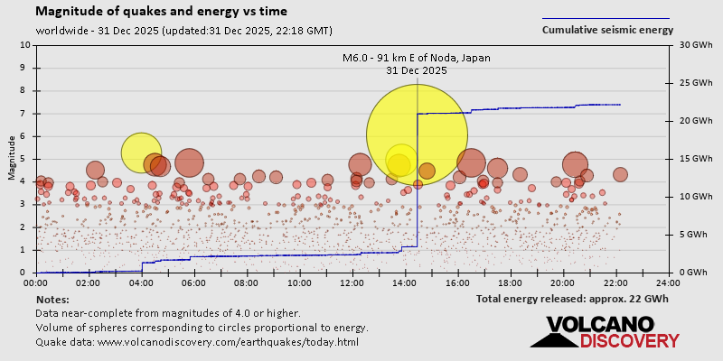 Earthquake data: Date & time: Dec 31, 2025 11:26 pm (GMT +9) local time (31 Dec 2025 14:26 GMT)Magnitude: 6.0 Depth: 19.30 km Epicenter latitude / longitude: 40.11°N / 142.89°E  ( Iwate, Japan) Primary data source: USGShttps://www.volcanodiscovery.com/earthquake/news/290756/Significant-magnitude-60-earthquake-96-km-northeast-of-Miyako-Japan.html