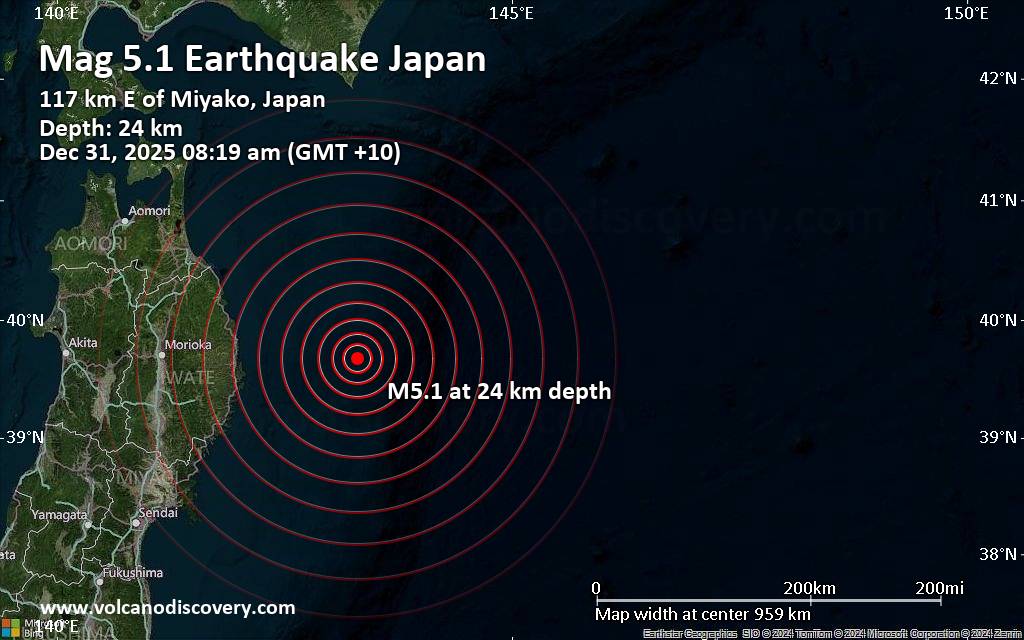 Significant magnitude 5.1 quake hits 117 km east of Miyako, Japan in the morning A magnitude 5.1 earthquake near Miyako, Miyako Shi, Iwate, Japan, was reported only 19 minutes ago by the United States Geological Survey, considered one of the key international agencies that monitor seismic activity worldwide. The earthquake occurred at a shallow depth of 23.73 km beneath the epicenter in the morning on Wednesday, December 31st, 2025, at 8:19 am local time. The exact magnitude, epicenter, and depth of the quake might be revised within the next few hours or minutes as seismologists review data and refine their calculations, or as other agencies issue their report. Our monitoring service identified a second report from the European-Mediterranean Seismological Centre (EMSC) which listed the quake at magnitude 5.1 as well. Other agencies reporting the same quake include the German Research Centre for Geosciences (GFZ) at magnitude 5.2, France's Réseau National de Surveillance Sismique (RéNaSS) at magnitude 5.2, and the citizen-seismograph network of RaspberryShake at magnitude 5.2. Based on the preliminary seismic data, the quake should not have caused any significant damage, but was probably felt by many people as light vibration in the area of the epicenter. Weak shaking might have been felt in Miyako (pop. 51,200) located 117 km from the epicenter. VolcanoDiscovery will automatically update magnitude and depth if these change and follow up if other significant news about the quake become available. If you’re in the area, please send us your experience through our reporting mechanism, either online or via our mobile app. This will help us provide more first-hand updates to anyone around the globe who wants to know more about this quake.