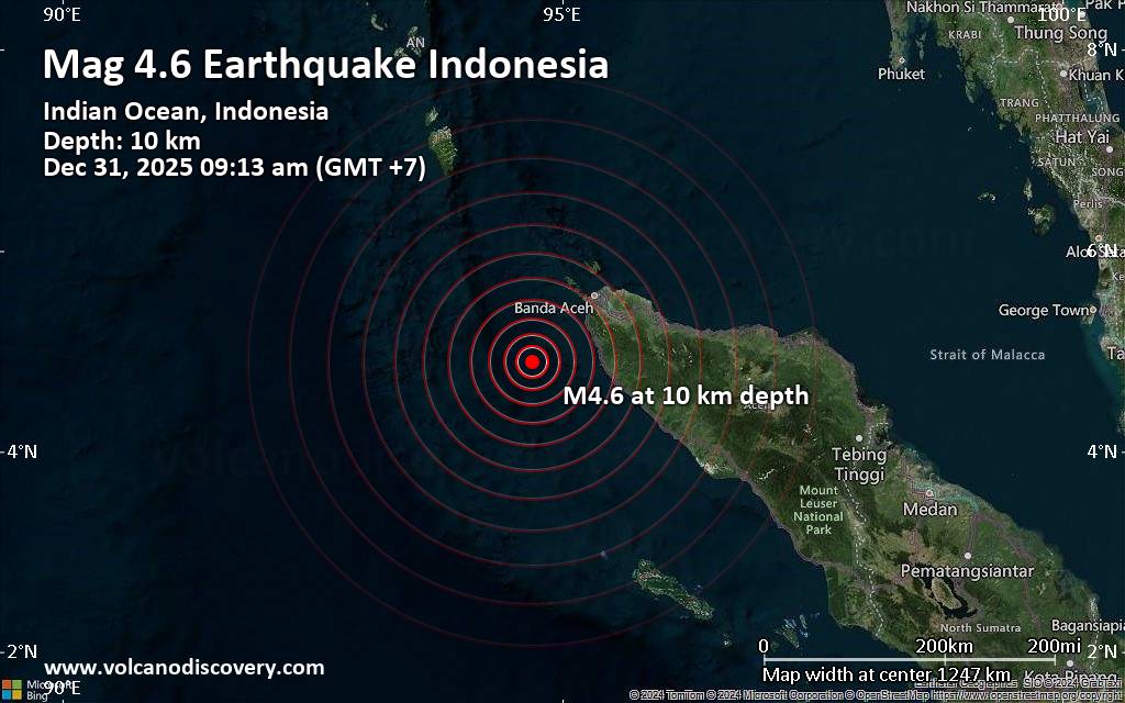 Earthquake data: Date & time: Dec 31, 2025 09:13 am (GMT +7) local time (31 Dec 2025 02:13 GMT)Magnitude: 4.6 Depth: 10.00 km Epicenter latitude / longitude: 4.9°N / 94.7°E  ( Indonesia) Primary data source: BMKGhttps://www.volcanodiscovery.com/earthquake/news/290668/Moderate-magnitude-46-quake-hits-100-km-southwest-of-Banda-Aceh-Indonesia-in-the-morning-.html