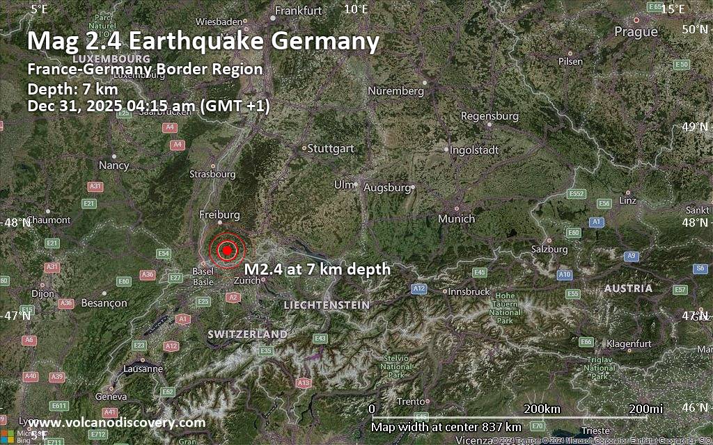 Earthquake data: Date & time: Dec 31, 2025 04:15 am (GMT +1) local time (31 Dec 2025 03:15 GMT)Magnitude: 2.4 Depth: 7.00 km Epicenter latitude / longitude: 47.7°N / 7.96°E  ( Landkreis Loerrach, Baden-Wurttemberg, Germany) Primary data source: EMSChttps://www.volcanodiscovery.com/earthquake/news/290672/Small-24-quake-hits-near-Schopfheim-Freiburg-Region-Baden-Wurttemberg-Germany.html