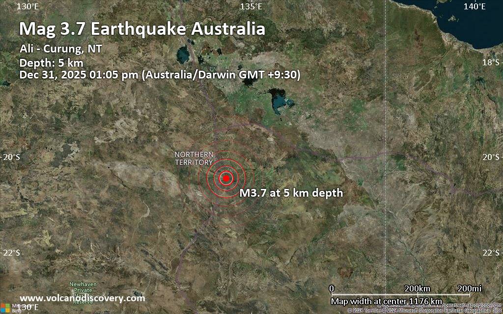 Earthquake data: Date & time: Dec 31, 2025 01:05 pm (Darwin time) local time (31 Dec 2025 03:35 GMT)Magnitude: 3.7 Depth: 5.00 km Epicenter latitude / longitude: 20.45°S / 134.44°E  ( Barkly, Northern Territory, Australia) Primary data source: GeoAuhttps://www.volcanodiscovery.com/earthquake/news/290676/Small-37-quake-hits-near-Tennant-Creek-Barkly-Northern-Territory-Australia.html