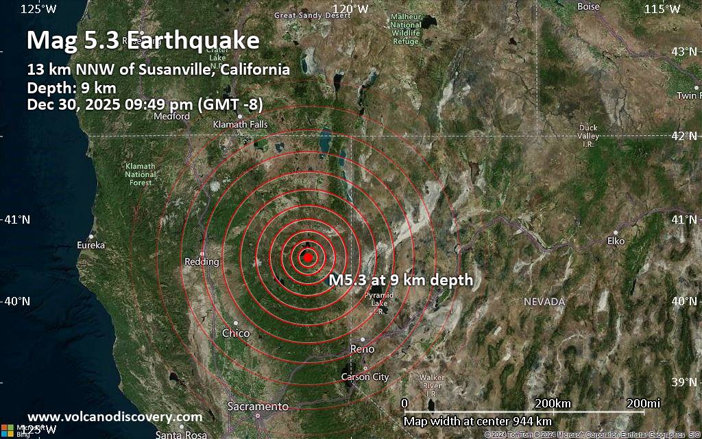 Earthquake data: Date & time: Dec 30, 2025 09:49 pm (Los Angeles time) local time (31 Dec 2025 05:49 GMT)Magnitude: 5.3 Depth: 9.00 km Epicenter latitude / longitude: 40.54°N / 120.68°W  ( Lassen County, California, United States) Primary data source: USGShttps://www.volcanodiscovery.com/earthquake/news/290693/Significant-53-quake-hits-near-Susanville-Lassen-County-California-USA.html