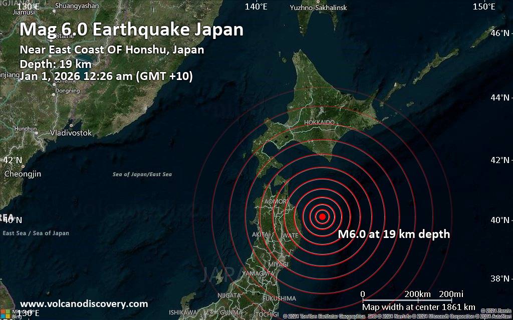 Significant magnitude 6.0 earthquake 96 km northeast of Miyako, Japan An earthquake of magnitude 6.0 occurred only 18 minutes ago 96 km northeast of Miyako, Japan, the European-Mediterranean Seismological Centre (EMSC) reported. The quake hit at a shallow depth of 19.30 km beneath the epicenter near Miyako, Miyako Shi, Iwate, Japan, after midnight on Thursday, January 1st, 2026, at 12:26 am local time. The exact magnitude, epicenter, and depth of the quake might be revised within the next few hours or minutes as seismologists review data and refine their calculations, or as other agencies issue their report. Our monitoring service identified a second report from the citizen-seismograph network of RaspberryShake which listed the quake at magnitude 5.8. Other agencies reporting the same quake include France's Réseau National de Surveillance Sismique (RéNaSS) at magnitude 5.6, and the German Research Centre for Geosciences (GFZ) at magnitude 5.8. Based on the preliminary seismic data, the quake was probably felt by many people in the area of the epicenter. It should not have caused significant damage, other than objects falling from shelves, broken windows, etc. In Miyako (pop. 51,200) located 96 km from the epicenter, Hachinohe (pop. 239,000) 125 km away, and Kamaishi (pop. 43,100) 127 km away, the quake should have been felt as light shaking. VolcanoDiscovery will automatically update magnitude and depth if these change and follow up if other significant news about the quake become available. If you’re in the area, please send us your experience through our reporting mechanism, either online or via our mobile app. This will help us provide more first-hand updates to anyone around the globe who wants to know more about this quake.
