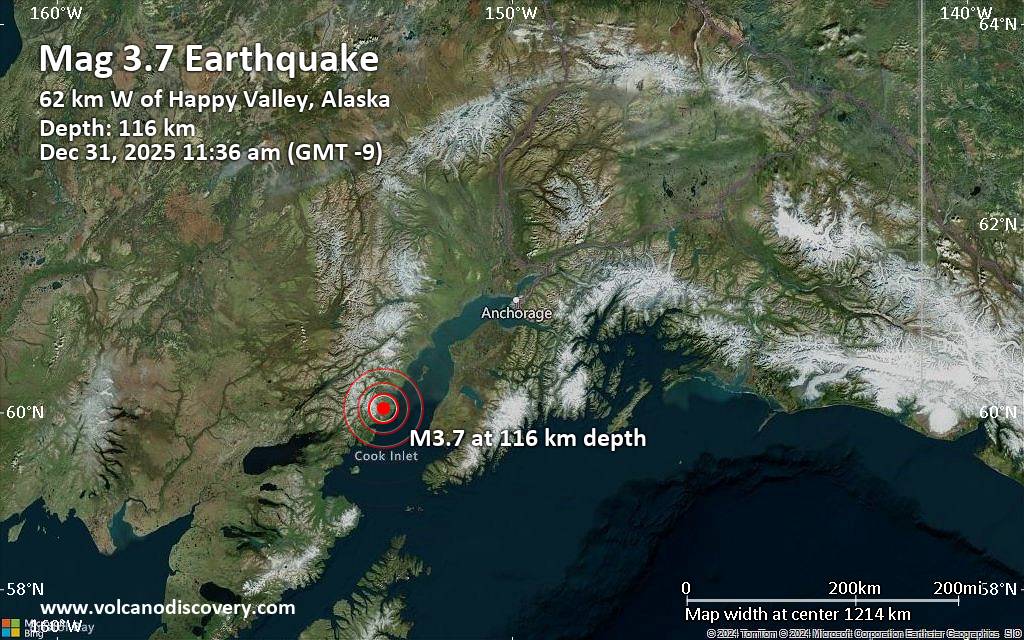 Earthquake data: Date & time: Dec 31, 2025 11:36 am (Anchorage time) local time (31 Dec 2025 20:36 GMT)Magnitude: 3.7 Depth: 116.10 km Epicenter latitude / longitude: 60.04°N / 152.83°W  ( Kenai Peninsula Borough, Alaska, United States) Primary data source: USGShttps://www.volcanodiscovery.com/earthquake/news/290766/Small-magnitude-37-earthquake-39-miles-northwest-of-Anchor-Point-Alaska-United-States.html