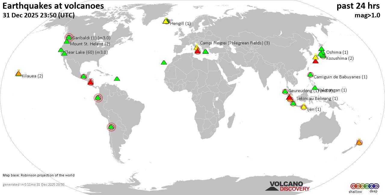 Volcano earthquake report for Wednesday, 31 Dec 2025 World map showing volcanoes with shallow (less than 50 km) earthquakes within 20 km radius during the past 24 hours on 31 Dec 2025 Number in brackets indicate nr of quakes. Quakes detected near: Akita-Komagatake (2 quakes between mag 1.1-1.6), Akita-Yake-yama (3 quakes between mag 0.6-1.2), Aso (44 quakes between mag 0.1-3.1), Atacazo (1 quake mag 3.0), Brennisteinsfjöll (18 quakes between mag 0.3-2.2), Camiguin de Babuyanes (1 quake mag 2.0) Campi Flegrei (Phlegrean Fields) (2 quakes between mag 0.3-1.2), Clear Lake (59 quakes between mag 0.2-3.0), Cleveland (1 quake mag 1.0), Coso (1 quake mag 1.1), El Chichón (1 quake mag 2.1), Eldey (1 quake mag 2.1), Etna (4 quakes between mag 1.3-2.1), Fisher (2 quakes between mag 1.2-1.2), Geureudong (1 quake mag 2.9), Hengill (1 quake mag 1.1), Hiuchi (1 quake mag 1.2), Ijen (1 quake mag 2.5), Iwate (1 quake mag 1.0), Kalatungan (1 quake mag 1.5), Kilauea (1 quake mag 1.8), Kozushima (2 quakes between mag 1.7-2.2), La Palma (1 quake mag 1.3), Ljósufjöll (7 quakes between mag 0.5-1.3), Loihi (1 quake mag 1.8), Marapi (1 quake mag 2.5), Masaya (1 quake mag 2.2), Maunaloa (1 quake mag 1.8), Methana (1 quake mag 1.8), Morne Plat Pays (1 quake mag 1.7), Mount St. Helens (2 quakes between mag 0.1-1.5), Nantai (2 quakes between mag 0.6-1.0), Nasu (1 quake mag 3.0), Ontake-san (9 quakes between mag 0.1-2.2), Sekincau Belirang (1 quake mag 2.4), Socompa (1 quake mag 3.0), Suwanose-jima (1 quake mag 1.6), Svartsengi (7 quakes between mag 0.4-1.8), Tandikat (1 quake mag 2.6), Westdahl (2 quakes between mag 1.1-1.8), White Island (1 quake mag 2.6) (updated 20h50) Note: Earthquakes within 20 km from and at depths less than 50 km under active volcanoes are reported. The list is not complete because many volcanoes are not monitored and/or seismic data in high resolution is not available publicly.