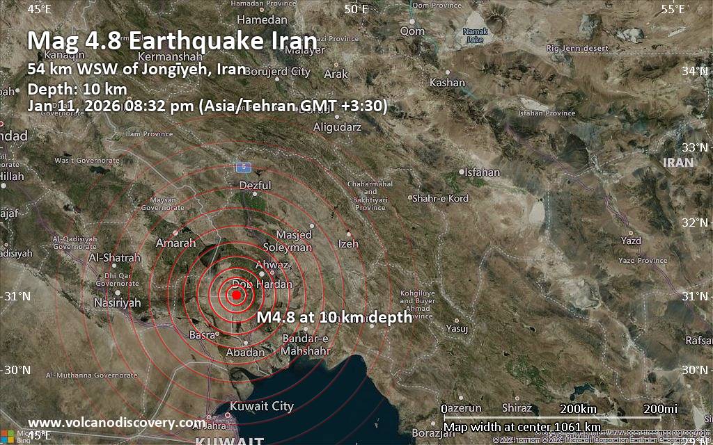 Moderate magnitude 4.8 earthquake 64 km southwest of Ahvāz, Iran A magnitude 4.8 earthquake near Ahvāz, Khuzestan, Iran, was reported only 21 minutes ago by the United States Geological Survey, considered one of the key international agencies that monitor seismic activity worldwide. The earthquake occurred at a shallow depth of 10. km beneath the epicenter in the evening on Sunday, January 11th, 2026, at 8:02 pm local time. The exact magnitude, epicenter, and depth of the quake might be revised within the next few hours or minutes as seismologists review data and refine their calculations, or as other agencies issue their report. Our monitoring service identified a second report from The Incorporated Research Institutions for Seismology (IRIS) which listed the quake at magnitude 4.8 as well. Other agencies reporting the same quake include the European-Mediterranean Seismological Centre (EMSC) at magnitude 4.8, the German Research Centre for Geosciences (GFZ) at magnitude 4.7, and the citizen-seismograph network of RaspberryShake at magnitude 4.8. Based on the preliminary seismic data, the quake should not have caused any significant damage, but was probably felt by many people as light vibration in the area of the epicenter. Weak shaking might have been felt in Jongiyeh (pop. 4,200) located 55 km from the epicenter, Kut-e 'Abdollah (pop. 56,300) 57 km away, Susangerd (pop. 41,400) 61 km away, Ahvāz (pop. 841,100) 64 km away, Khorramshahr (pop. 330,600) 65 km away, Shadegan (pop. 41,700) 68 km away, Sheyban (pop. 36,400) 78 km away, and Ābādān (pop. 370,200) 78 km away. VolcanoDiscovery will automatically update magnitude and depth if these change and follow up if other significant news about the quake become available. If you’re in the area, please send us your experience through our reporting mechanism, either online or via our mobile app. This will help us provide more first-hand updates to anyone around the globe who wants to know more about this quake.