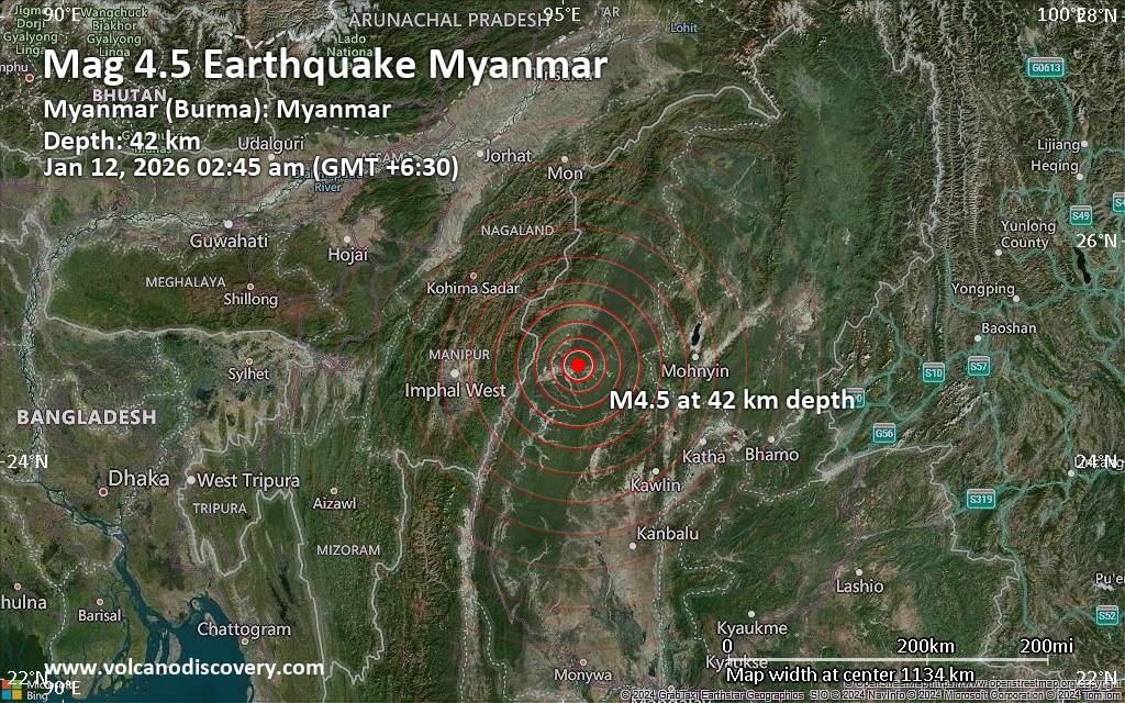 Magnitude 4.5 earthquake strikes near Tatkon, Hkamti District, Sagaing Region, Myanmar (Burma) Just 17 minutes ago, a 4.5-magnitude earthquake struck near Tatkon, Hkamti District, Sagaing Region, Myanmar (Burma). The tremor was recorded early morning on Monday, January 12th, 2026, at 2:15 am local time, at a moderately shallow depth of 42. km below the surface. The event was filed by Thailand's Earthquake Observation Division (TMD), the first seismological agency to report it. Based on the preliminary seismic data, the quake should not have caused any significant damage, but was probably felt by many people as light vibration in the area of the epicenter. Weak shaking might have been felt in Tatkon (pop. 41,700) located 23 km from the epicenter, and Homalin (pop. 1,500) 26 km away. Other towns or cities near the epicenter where the quake might have been felt as very weak shaking include Minsin (pop. 1,800) located 76 km from the epicenter, Ukhrul (pop. 27,200) 85 km away, and Kyauktan (pop. 42,800) 99 km away. VolcanoDiscovery will automatically update magnitude and depth if these change and follow up if other significant news about the quake become available. If you’re in the area, please send us your experience through our reporting mechanism, either online or via our mobile app. This will help us provide more first-hand updates to anyone around the globe who wants to know more about this quake.
