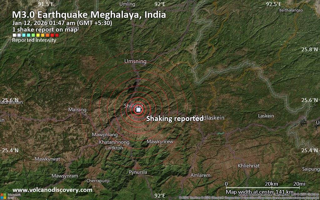 Earthquake data: Date & time: Jan 12, 2026 01:47 am (GMT +5:30) local time (11 Jan 2026 20:17 GMT)Magnitude: unspecified Depth: unspecified Epicenter latitude / longitude: 25.56°N / 91.9°E  ( Meghalaya, India) Primary data source: VolcanoDiscoveryhttps://www.volcanodiscovery.com/earthquake/news/291717/Seismic-like-event-possible-earthquake-reported-few-minutes-ago-near-Shillong-Meghalaya-India.html