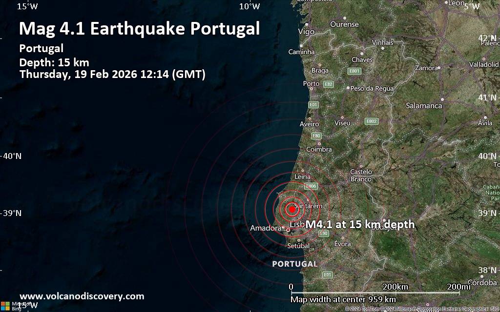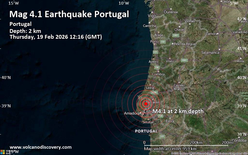 Earthquake data: Date & time: Feb 19, 2026 12:16 pm (GMT +0) local time (19 Feb 2026 12:16 GMT)Magnitude: 4.1 Depth: 2.00 km Epicenter latitude / longitude: 39.08°N / 9.01°W  (Alenquer, Distrito de Lisboa, Portugal) Primary data source: EMSChttps://www.volcanodiscovery.com/earthquake/news/295341/Magnitude-41-earthquake-strikes-near-Lisbon-Distrito-de-Lisboa-Portugal.html