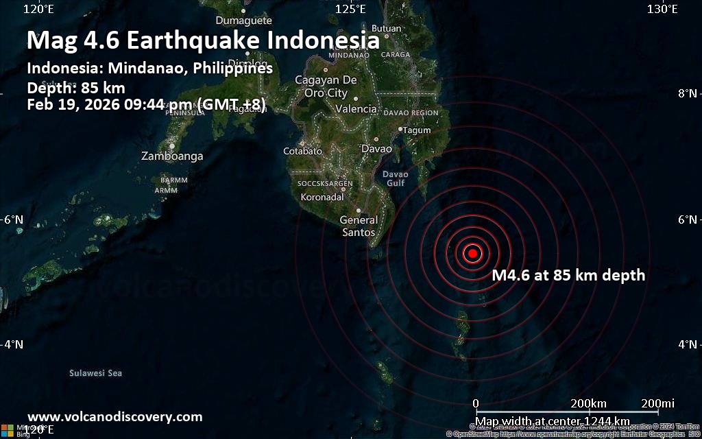 Moderate magnitude 4.6 earthquake 42 km southeast of Miangas, Indonesia A magnitude 4.6 earthquake near Miangas, Sulawesi Utara, Indonesia, was reported only 13 minutes ago by Indonesia's Meteorology, Climatology, and Geophysical Agency, considered the main national agency that monitors seismic activity in Indonesia. The earthquake occurred at an intermediate depth of 85. km beneath the epicenter in the evening on Thursday, February 19th, 2026, at 9:44 pm local time. The exact magnitude, epicenter, and depth of the quake might be revised within the next few hours or minutes as seismologists review data and refine their calculations, or as other agencies issue their report. Our monitoring service identified a second report from the Philippine Institute of Volcanology and Seismology (PHIVOLCS) which listed the quake at magnitude 3.9. A third agency, the citizen-seismograph network of RaspberryShake, reported the same quake at magnitude 4.6. Towns or cities near the epicenter where the quake might have been felt as very weak shaking include Miangas (pop. 820) located 42 km from the epicenter. VolcanoDiscovery will automatically update magnitude and depth if these change and follow up if other significant news about the quake become available. If you’re in the area, please send us your experience through our reporting mechanism, either online or via our mobile app. This will help us provide more first-hand updates to anyone around the globe who wants to know more about this quake.
