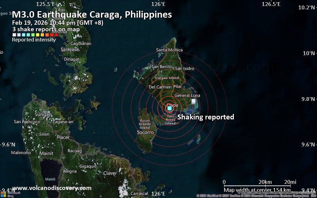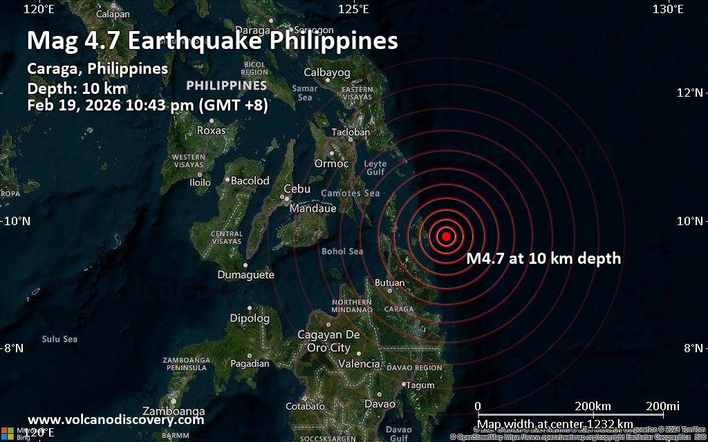 Moderate earthquake of magnitude 4.7 just reported 81 km northeast of Tandag, Philippines The Philippine Institute of Volcanology and Seismology (PHIVOLCS) reported a magnitude 4.7 quake in the Philippines near Tandag, Surigao del Sur, Caraga, only 8 minutes ago. The earthquake hit late at night on Thursday, February 19th, 2026, at 10:43 pm local time at a shallow depth of 10. km. The exact magnitude, epicenter, and depth of the quake might be revised within the next few hours or minutes as seismologists review data and refine their calculations, or as other agencies issue their report. Our monitoring service identified a second report from the citizen-seismograph network of RaspberryShake which listed the quake at magnitude 4.7 as well. Based on the preliminary seismic data, the quake should not have caused any significant damage, but was probably felt by many people as light vibration in the area of the epicenter. Weak shaking might have been felt in Union (pop. 2,400) located 39 km from the epicenter, Pilar (pop. 2,400) 42 km away, Dapa (pop. 8,800) 46 km away, Socorro (pop. 9,700) 57 km away, Cantilan (pop. 9,400) 72 km away, and Tandag (pop. 29,000) 81 km away. Other towns or cities near the epicenter where the quake might have been felt as very weak shaking include Surigao (pop. 87,800) located 107 km from the epicenter. VolcanoDiscovery will automatically update magnitude and depth if these change and follow up if other significant news about the quake become available. If you’re in the area, please send us your experience through our reporting mechanism, either online or via our mobile app. This will help us provide more first-hand updates to anyone around the globe who wants to know more about this quake.