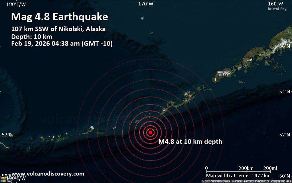 Moderate earthquake of magnitude 4.8 just reported 67 miles southwest of Nikolski, Alaska, United States An earthquake of magnitude 4.8 occurred only 24 minutes ago 67 miles southwest of Nikolski, Alaska, United States, the United States Geological Survey reported. The quake hit at a shallow depth of 6.2 miles beneath the epicenter near Nikolski, Aleutians West, Alaska, USA, early morning on Thursday, February 19th, 2026, at 4:38 am local time. The exact magnitude, epicenter, and depth of the quake might be revised within the next few hours or minutes as seismologists review data and refine their calculations, or as other agencies issue their report. A second report was later issued by The Incorporated Research Institutions for Seismology (IRIS), which listed it as a magnitude 4.8 earthquake as well. Other agencies reporting the same quake include the European-Mediterranean Seismological Centre (EMSC) at magnitude 4.8, the German Research Centre for Geosciences (GFZ) at magnitude 4.8, France's Réseau National de Surveillance Sismique (RéNaSS) at magnitude 5.0, and the citizen-seismograph network of RaspberryShake at magnitude 4.9. Towns or cities near the epicenter where the quake might have been felt as very weak shaking include Nikolski (pop. 18) located 67 miles from the epicenter. VolcanoDiscovery will automatically update magnitude and depth if these change and follow up if other significant news about the quake become available. If you’re in the area, please send us your experience through our reporting mechanism, either online or via our mobile app. This will help us provide more first-hand updates to anyone around the globe who wants to know more about this quake.