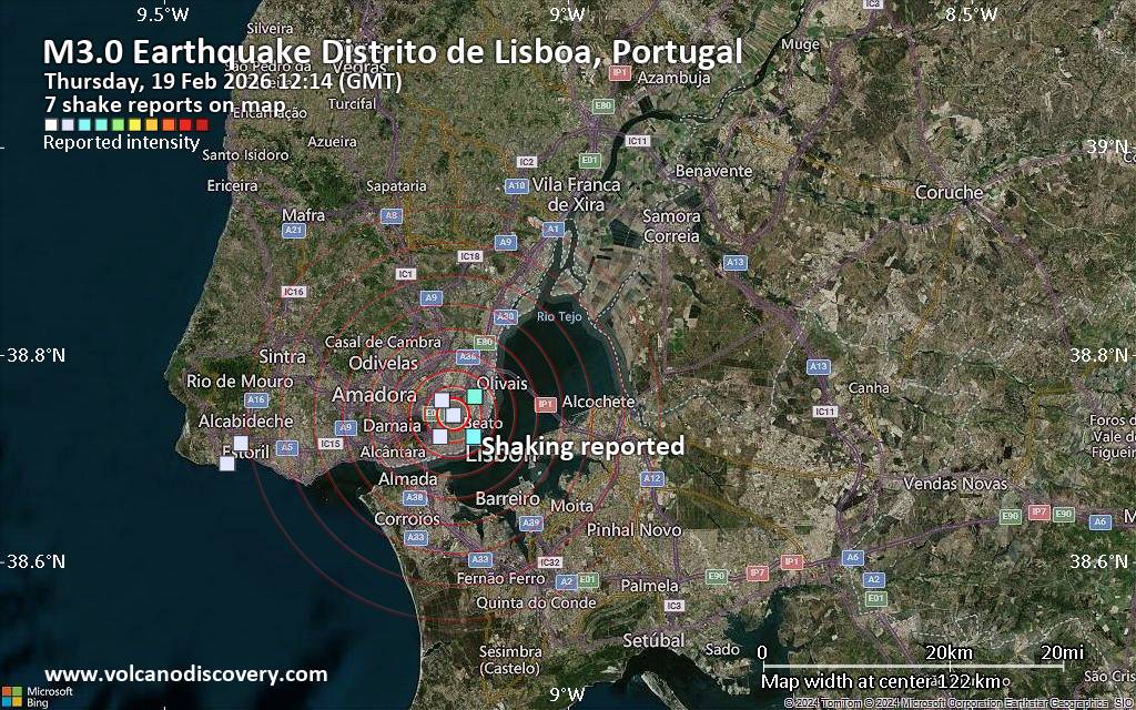 Moderate earthquake of magnitude 4.1 just reported 39 km northeast of Lisbon, Portugal Just 10 minutes ago, a 4.1-magnitude earthquake struck near Lisbon, Distrito de Lisboa, Portugal. The tremor was recorded around noon on Thursday, February 19th, 2026, at 12:14 pm local time, at a shallow depth of 14.60 km below the surface. The event was filed by the European-Mediterranean Seismological Centre (EMSC), the first seismological agency to report it. A second report was later issued by the citizen-seismograph network of RaspberryShake, which listed it as a magnitude 3.6 earthquake. A third agency, Spain's Instituto Geográfico Nacional (IGN), reported the same quake at magnitude 3.6. Based on the preliminary seismic data, the quake should not have caused any significant damage, but was probably felt by many people as light vibration in the area of the epicenter. Weak shaking might have been felt in Meca (pop. 1,700) located 2 km from the epicenter, Vila Franca de Xira (pop. 18,400) 14 km away, Azambuja (pop. 21,400) 16 km away, Torres Vedras (pop. 24,400) 18 km away, Loures (pop. 66,200) 29 km away, and Odivelas (pop. 54,600) 33 km away. Other towns or cities near the epicenter where the quake might have been felt as very weak shaking include Amadora (pop. 178,900) located 39 km from the epicenter, Queluz (pop. 103,400) 39 km away, Lisbon (pop. 517,800) 39 km away, and Cacem (pop. 94,000) 40 km away.