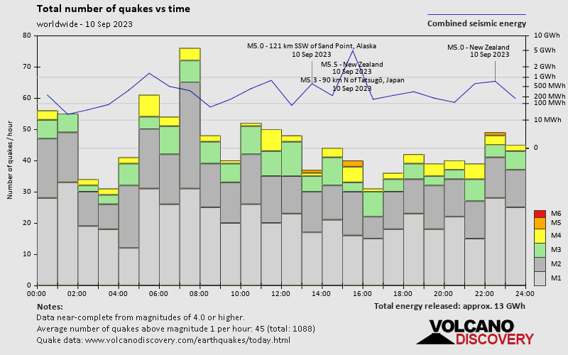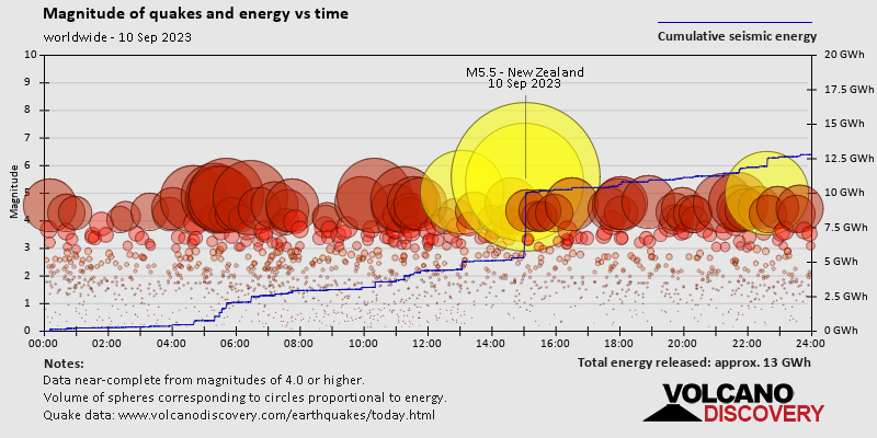 World Earthquake Report for Sunday, 10 September 2023 Worldwide earthquakes above magnitude 3 during the past 24 hours on 10 Sep 2023 Summary: 1 quake 6.0+, 43 quakes 4.0+, 135 quakes 3.0+, 287 quakes 2.0+ (466 total)This report is being updated every hour.Magnitude 6+: 1 earthquake Magnitude 4+: 43 earthquakes Magnitude 3+: 135 earthquakes Magnitude 2+: 287 earthquakes No quakes of magnitude 5 or higher 10 largest earthquakes in the world (past 24 hours)Saturday, Sep 9, 2023 at 10:43 pm (GMT +8) - Sunday, Sep 10, 2023 at 2:03 am (GMT -11) - Sunday, Sep 10, 2023 at 7:21 pm (GMT +9) - Sunday, Sep 10, 2023 at 12:28 am (GMT -6) - Sunday, Sep 10, 2023 at 2:42 pm (GMT +9) - Sunday, Sep 10, 2023 at 2:41 pm (GMT +10) - Sunday, Sep 10, 2023 at 5:15 am (GMT -6) - Sunday, Sep 10, 2023 at 2:28 pm (GMT +9) - Sunday, Sep 10, 2023 at 9:49 am (GMT +4:30) - Saturday, Sep 9, 2023 at 9:06 am (GMT -9) - Earthquakes reported feltSunday, Sep 10, 2023 at 2:43 am (GMT +2) - Sunday, Sep 10, 2023 at 9:00 am (GMT +1) - Saturday, Sep 9, 2023 at 3:49 pm (GMT +1) - Sunday, Sep 10, 2023 at 12:11 am (GMT +1) - Saturday, Sep 9, 2023 at 10:52 pm (GMT +1) - Sunday, Sep 10, 2023 at 4:18 am (GMT +1) - Sunday, Sep 10, 2023 at 12:56 am (GMT -1) - Sunday, Sep 10, 2023 at 7:34 am (GMT -4) - Sunday, Sep 10, 2023 at 12:47 pm (GMT +2) - Saturday, Sep 9, 2023 at 11:24 pm (GMT +2) - Saturday, Sep 9, 2023 at 5:03 pm (GMT -3) - Sunday, Sep 10, 2023 at 1:42 am (GMT +1) - Saturday, Sep 9, 2023 at 10:43 pm (GMT +8) - Saturday, Sep 9, 2023 at 4:42 pm (GMT +1) - Sunday, Sep 10, 2023 at 7:36 am (GMT +1) - Sunday, Sep 10, 2023 at 4:38 am (GMT -3) - Sunday, Sep 10, 2023 at 1:37 am (GMT +1) - Sunday, Sep 10, 2023 at 12:22 am (GMT +1) - Earthquake stats  https://www.volcanodiscovery.com/earthquake/news/220519/World-Earthquake-Report-for-Sunday-10-September-2023.html