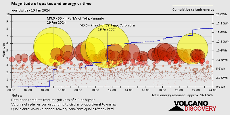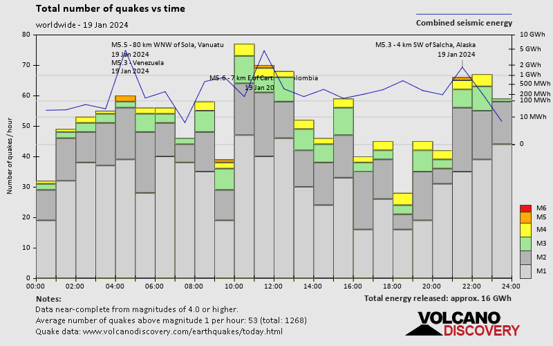 World Earthquake Report for Friday, 19 January 2024 Worldwide earthquakes above magnitude 3 during the past 24 hours on 20 Jan 2024 Summary: 6 quakes 5.0+, 31 quakes 4.0+, 104 quakes 3.0+, 241 quakes 2.0+ (382 total)Magnitude 5+: 6 earthquakes Magnitude 4+: 31 earthquakes Magnitude 3+: 104 earthquakes Magnitude 2+: 241 earthquakes No quakes of magnitude 6 or higher 10 largest earthquakes in the world (19 Jan 2024)Friday, Jan 19, 2024, at 06:26 am (Bogota time) - Friday, Jan 19, 2024, at 03:57 pm (Efate time) - Friday, Jan 19, 2024, at 01:34 pm (Anchorage time) - Friday, Jan 19, 2024, at 12:31 am (Caracas time) - Friday, Jan 19, 2024, at 06:40 am (Salta time) - Friday, Jan 19, 2024, at 07:49 pm (Efate time) - Friday, Jan 19, 2024, at 10:05 pm (GMT +4) - Friday, Jan 19, 2024, at 05:14 pm (Athens time) - Friday, Jan 19, 2024, at 07:19 am (Lima time) - Friday, Jan 19, 2024, at 01:49 pm (GMT +5:30) - Earthquakes reported feltFriday, Jan 19, 2024, at 06:26 am (Bogota time) - Friday, Jan 19, 2024, at 01:34 pm (Anchorage time) - Friday, Jan 19, 2024, at 09:28 pm (Vienna time) - Friday, Jan 19, 2024, at 05:14 pm (Athens time) - Friday, Jan 19, 2024, at 04:30 am (Vienna time) - Friday, Jan 19, 2024, at 10:05 pm (GMT +4) - Friday, Jan 19, 2024, at 10:03 am (Algiers time) - Saturday, Jan 20, 2024, at 03:57 am (Sakhalin time) - Friday, Jan 19, 2024, at 04:53 am (Algiers time) - Friday, Jan 19, 2024, at 06:40 am (Salta time) - Thursday, Jan 18, 2024, at 02:54 pm (GMT -10) - Saturday, Jan 20, 2024, at 12:10 am (Madrid time) - Friday, Jan 19, 2024, at 05:33 pm (Athens time) - Thursday, Jan 18, 2024, at 08:29 pm (Mexico City time) - Friday, Jan 19, 2024, at 03:43 pm (GMT +9) - Friday, Jan 19, 2024, at 09:19 pm (GMT +9) - Saturday, Jan 20, 2024, at 02:59 am (GMT +7) - Saturday, Jan 20, 2024, at 06:59 am (GMT +9) - Saturday, Jan 20, 2024, at 12:47 am (Auckland time) - Friday, Jan 19, 2024, at 09:37 pm (Tirane time) - Earthquake stats  https://www.volcanodiscovery.com/earthquake/news/231849/World-Earthquake-Report-for-Friday-19-January-2024.html