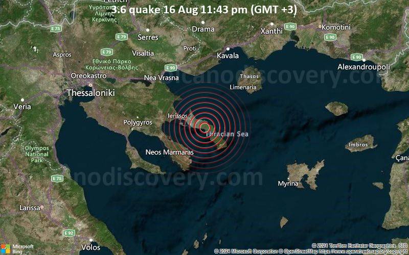 Earthquake data: Date & time: Aug 16, 2024 11:43 pm (Athens time) local time (16 Aug 2024 20:43 GMT)Magnitude: 3.6 Depth: 10.0 km Epicenter latitude / longitude: 40.3°N / 24.16°E  ( Mount Athos, Greece) Primary data source: EMSChttps://www.volcanodiscovery.com/earthquake/news/249861/Small-magnitude-36-quake-hits-27-km-southeast-of-Ierissos-Greece-late-at-night-.html