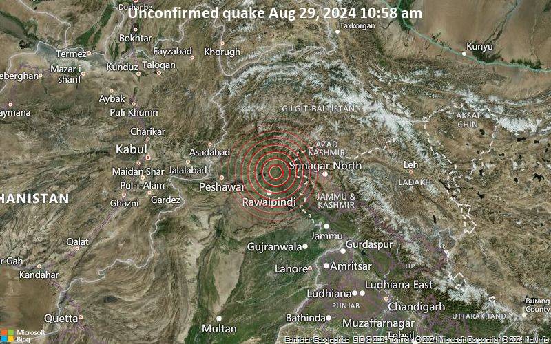 Earthquake data: Date & time: Aug 29, 2024 10:58 am (GMT +5) local time (29 Aug 2024 05:58 GMT)Magnitude: unspecified Depth: unspecified Epicenter latitude / longitude: 34.17°N / 73.23°E  ( Azad Kashmir, Pakistan) Primary data source: VolcanoDiscoveryhttps://www.volcanodiscovery.com/earthquake/news/250965/Seismic-like-event-possible-earthquake-reported-few-minutes-ago-near-Muzaffarabad-Azad-Kashmir-Pakis.html