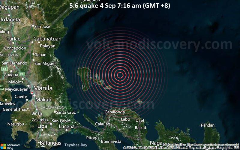 Significant earthquake of magnitude 5.6 just reported 98 km northwest of Daet, Philippines 5.6 quake 4 Sep 7:16 am (GMT +8) The Philippines was shaken near Daet, Camarines Norte, Bicol, by an earthquake of magnitude 5.6 only 5 minutes ago, the Philippine Institute of Volcanology and Seismology (PHIVOLCS) reported. The quake hit at a shallow depth of 10 km beneath the epicenter near Daet, Camarines Norte, Bicol, Philippines, in the morning on Wednesday, September 4th, 2024, at 7:16 am local time. Shallow earthquakes are felt more strongly than deeper ones as they are closer to the surface. The exact magnitude, epicenter, and depth of the quake might be revised within the next few hours or minutes as seismologists review data and refine their calculations, or as other agencies issue their report. Based on the preliminary seismic data, the quake was probably felt by many people in the area of the epicenter. It should not have caused significant damage, other than objects falling from shelves, broken windows, etc. In Jose Panganiban (pop. 21,200) located 71 km from the epicenter, and Santa Elena (pop. 14,600) 86 km away, the quake should have been felt as light shaking. Weak shaking might have been felt in Labo (pop. 18,100) located 89 km from the epicenter, Vinzons (pop. 13,600) 90 km away, and Daet (pop. 78,100) 98 km away. VolcanoDiscovery will automatically update magnitude and depth if these change and follow up if other significant news about the quake become available. If you’re in the area, please send us your experience through our reporting mechanism, either online or via our mobile app. This will help us provide more first-hand updates to anyone around the globe who wants to know more about this quake.