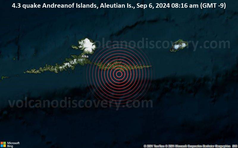 Magnitude 4.3 earthquake strikes near Atka, Aleutians West, Alaska, USA 4.3 quake Andreanof Islands, Aleutian Is., Sep 6, 2024 08:16 am (GMT -9) Just 29 minutes ago, a 4.3-magnitude earthquake struck near Atka, Aleutians West, Alaska, USA. The tremor was recorded in the morning on Friday, September 6th, 2024, at 8:16 am local time, at a moderately shallow depth of 42 miles below the surface. The event was filed by the United States Geological Survey, the first seismological agency to report it. A second report was later issued by the European-Mediterranean Seismological Centre (EMSC), which listed it as a magnitude 4.3 earthquake as well. Towns or cities near the epicenter where the quake might have been felt as very weak shaking include Atka (pop. 64) located 30 miles from the epicenter. VolcanoDiscovery will automatically update magnitude and depth if these change and follow up if other significant news about the quake become available. If you’re in the area, please send us your experience through our reporting mechanism, either online or via our mobile app. This will help us provide more first-hand updates to anyone around the globe who wants to know more about this quake.
