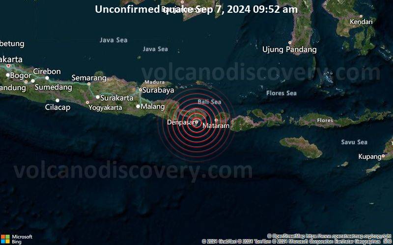 Seismic-like event, possible earthquake, reported few minutes ago near Denpasar, Bali, Indonesia Unconfirmed earthquake or seismic-like event: 4 km south of Denpasar, Bali, Indonesia, 2 minutes ago We are receiving unverified early reports of ground shaking possibly caused by seismic activity in or near Denpasar, Bali, Indonesia on 7 Sep 2024 (GMT) at approximately 01:52 GMT. There are no details yet on the magnitude or depth of this possible quake. If confirmed, we can expect more accurate data to emerge in the next few minutes. The location, magnitude and time mentioned are indicative, based on our best-fit seismic model. They are temporary until our AllQuakes monitoring service receives more exact scientific data from a national or international seismological agency. Check back here shortly and stay safe.