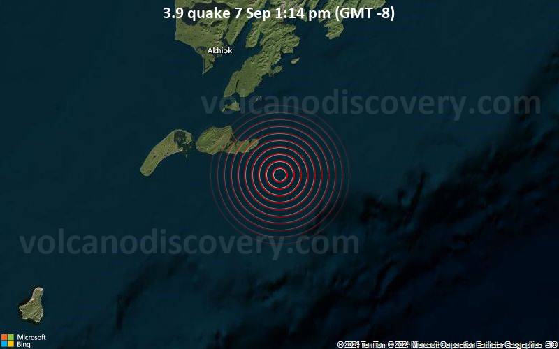 Small magnitude 3.9 quake hits 41 miles southeast of Akhiok, Alaska, United States around noon 3.9 quake 7 Sep 1:14 pm (GMT -8) An earthquake of magnitude 3.9 occurred only 18 minutes ago 41 miles southeast of Akhiok, Alaska, United States, the United States Geological Survey reported. The quake hit at a very shallow depth of 3.1 miles beneath the epicenter near Akhiok, Kodiak Island, Alaska, USA, around noon on Saturday, September 7th, 2024, at 1:14 pm local time. The exact magnitude, epicenter, and depth of the quake might be revised within the next few hours or minutes as seismologists review data and refine their calculations, or as other agencies issue their report. A second report was later issued by The Incorporated Research Institutions for Seismology (IRIS), which listed it as a magnitude 3.2 earthquake. A third agency, the European-Mediterranean Seismological Centre (EMSC), reported the same quake at magnitude 3.9. Towns or cities near the epicenter where the quake might have been felt as very weak shaking include Akhiok (pop. 72) located 41 miles from the epicenter, and Old Harbor (pop. 220) 57 miles away.