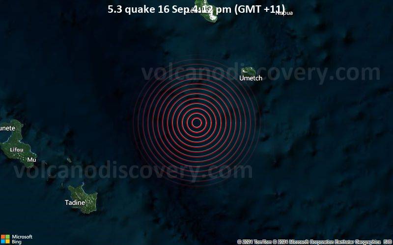 Significant magnitude 5.3 quake hits 130 km south of Isangel, Vanuatu in the afternoon 5.3 quake 16 Sep 4:12 pm (GMT +11) A magnitude 5.3 earthquake near Isangel, Tafea, Vanuatu, was reported only 12 minutes ago by the German Research Centre for Geosciences (GFZ), considered one of the key international agencies that monitor seismic activity worldwide. The earthquake occurred at a shallow depth of 10 km beneath the epicenter in the afternoon on Monday, September 16th, 2024, at 4:12 pm local time. The exact magnitude, epicenter, and depth of the quake might be revised within the next few hours or minutes as seismologists review data and refine their calculations, or as other agencies issue their report. Based on the preliminary seismic data, the quake should not have caused any significant damage, but was probably felt by many people as light vibration in the area of the epicenter. Weak shaking might have been felt in Isangel (pop. 1,400) located 130 km from the epicenter. VolcanoDiscovery will automatically update magnitude and depth if these change and follow up if other significant news about the quake become available. If you’re in the area, please send us your experience through our reporting mechanism, either online or via our mobile app. This will help us provide more first-hand updates to anyone around the globe who wants to know more about this quake.