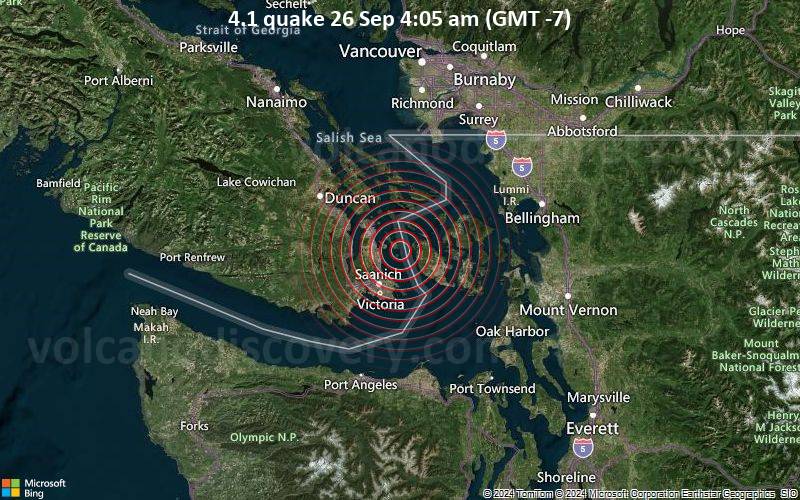 Earthquake data: Date & time: Sep 26, 2024 04:05 am (Vancouver time) local time (26 Sep 2024 11:05 GMT)Magnitude: 4.1 Depth: 55.4 km Epicenter latitude / longitude: 48.59°N / 123.26°W  (Capital Regional District, British Columbia, Canada) Primary data source: USGShttps://www.volcanodiscovery.com/earthquake/news/253478/Moderate-magnitude-41-quake-hits-11-miles-northeast-of-Victoria-Canada-early-morning-.html